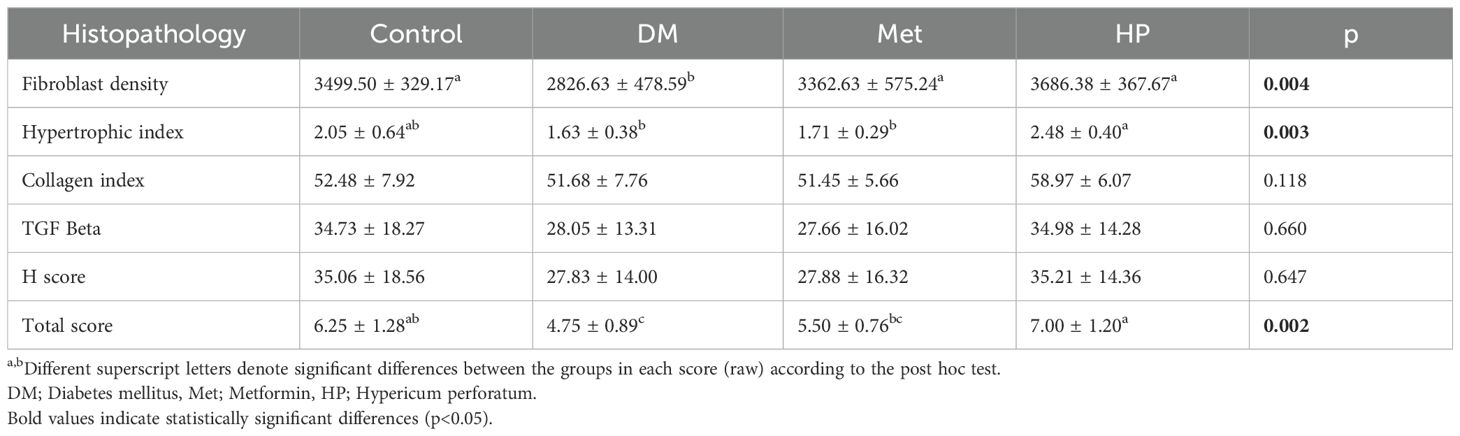 There was no statistically significant difference among the groups in the collagen index, TGF-β percentage, and H scores (p = 0.118, p = 0.660, and p = 0.647). The fibroblast density scores of the DM group were significantly lower than those of the other groups (p=0.004). The hypertrophic index values of the HP group were the highest compared to those of the other groups (p = 0.003). Despite the statistical significance of this difference, the findings should be approached with caution owing to the limited sample size. When evaluating the total histopathological scores, the HP group had the highest score, followed by the control, the Met, and the DM groups, in that order (p = 0.002). TGF Beta was broadly expressed but at very low levels. Although the HP and control groups showed higher scores than the other groups, the differences were not statistically significant (Table 6).