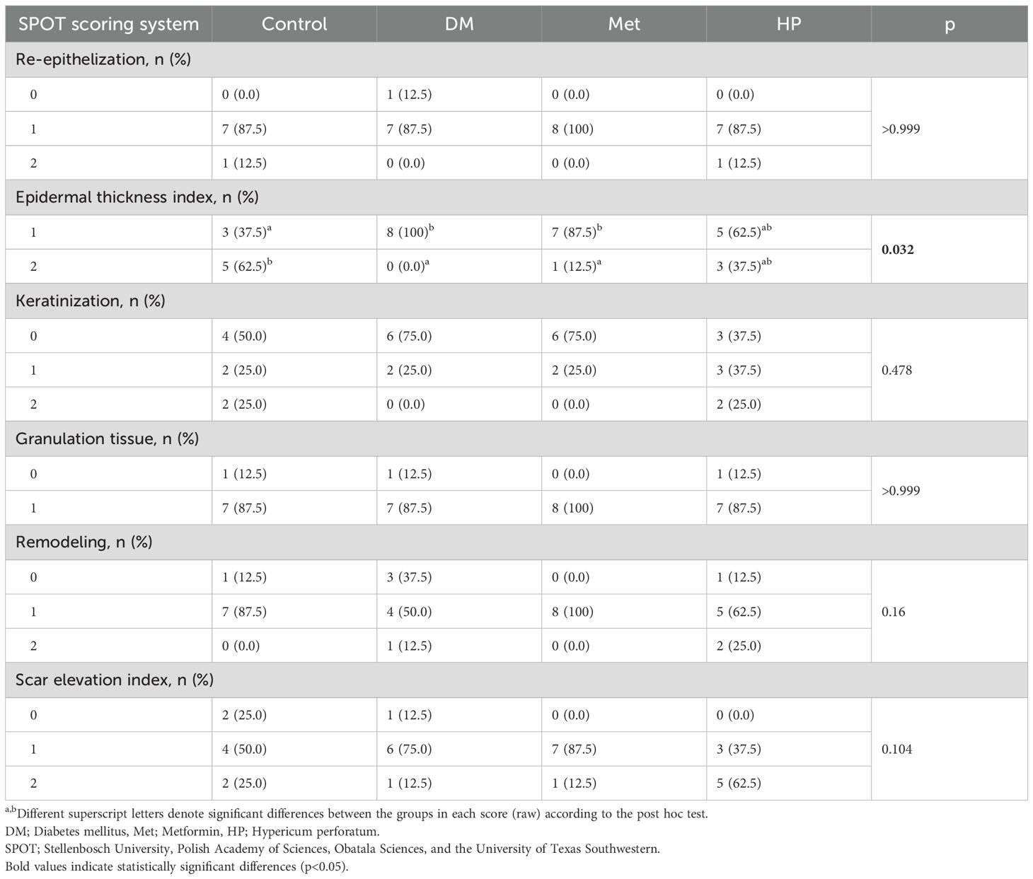 When the components that make up the SPOT score are examined in detail, no statistically significant differences were found between the groups regarding re-epithelization, keratinization, granulation tissue, remodeling, and scar elevation index (p > 0.999, p = 0.478, p > 0.999, p = 0.160, and p = 0.104). The only notable difference was observed in the epidermal thickness index, where all rats in the DM and 7 (87.5%) rats in the Met groups had a score of 1, which was significantly lower than that of the control and the HP groups (p = 0.032) (Table 7).