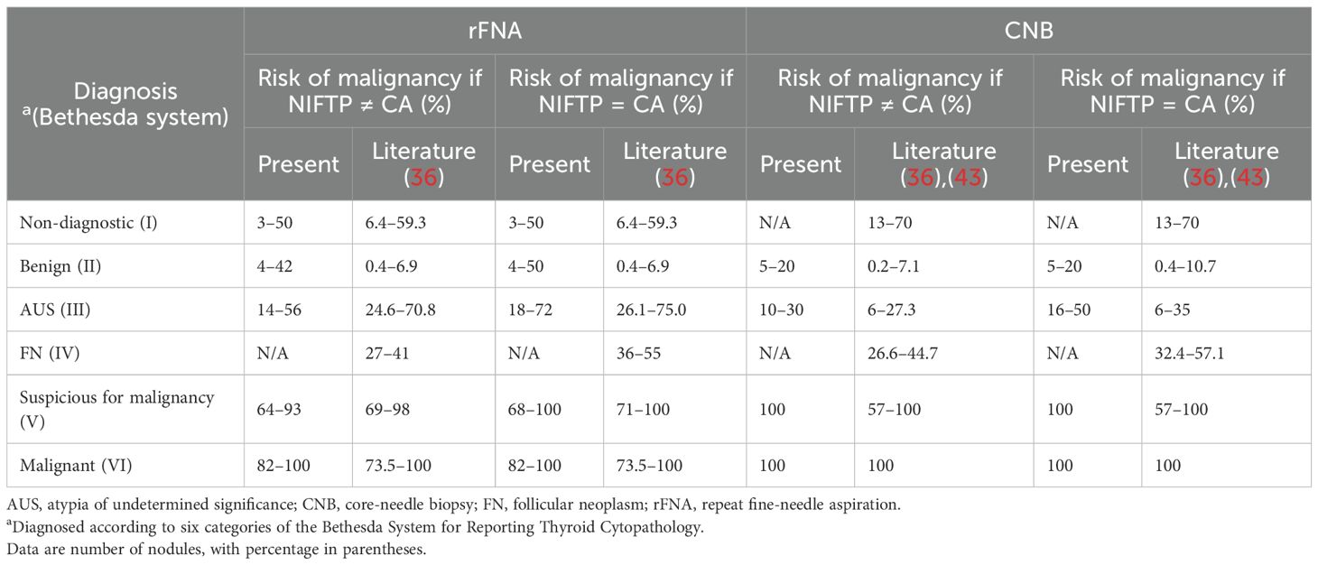 Conclusion: CNB may serve as a more reliable diagnostic tool for cases initially classified as AUS, particularly when repeat insufficient results are obtained or when diagnosing FNs and NIFTP.