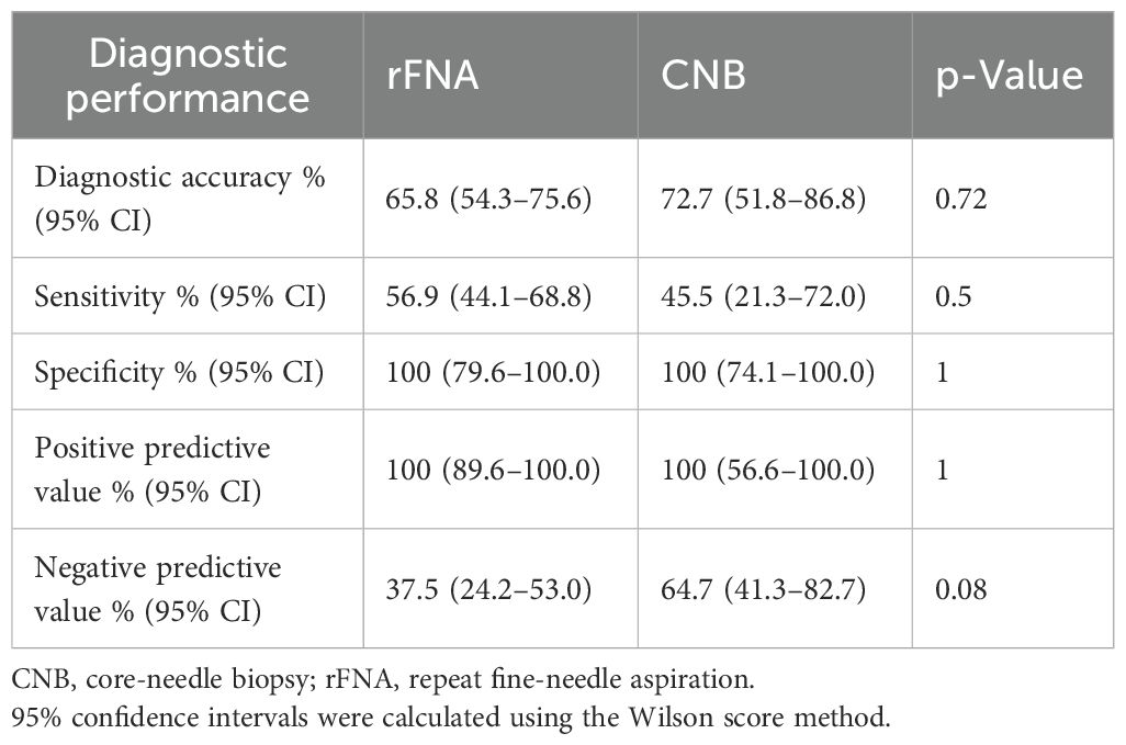 Several studies have proposed core-needle biopsy (CNB) as an alternative or complementary tool to FNA (12–14). CNB is safe, well-tolerated, and associated with a low incidence of complications when performed by experienced operators (12, 15). Importantly, CNB has the potential to overcome some inherent limitations of FNA by obtaining larger tissue samples, thereby reducing non-diagnostic results due to scant follicular cells and enabling more detailed assessment of histological architecture and the tumor capsule. In addition, CNB specimens allow for immunohistochemical analysis, which may further aid in differential diagnosis. Previous studies have consistently reported that CNB yields lower rates of inconclusive results, including non-diagnostic or AUS, compared with repeat FNA in nodules with prior indeterminate cytology (13, 14, 16–18).