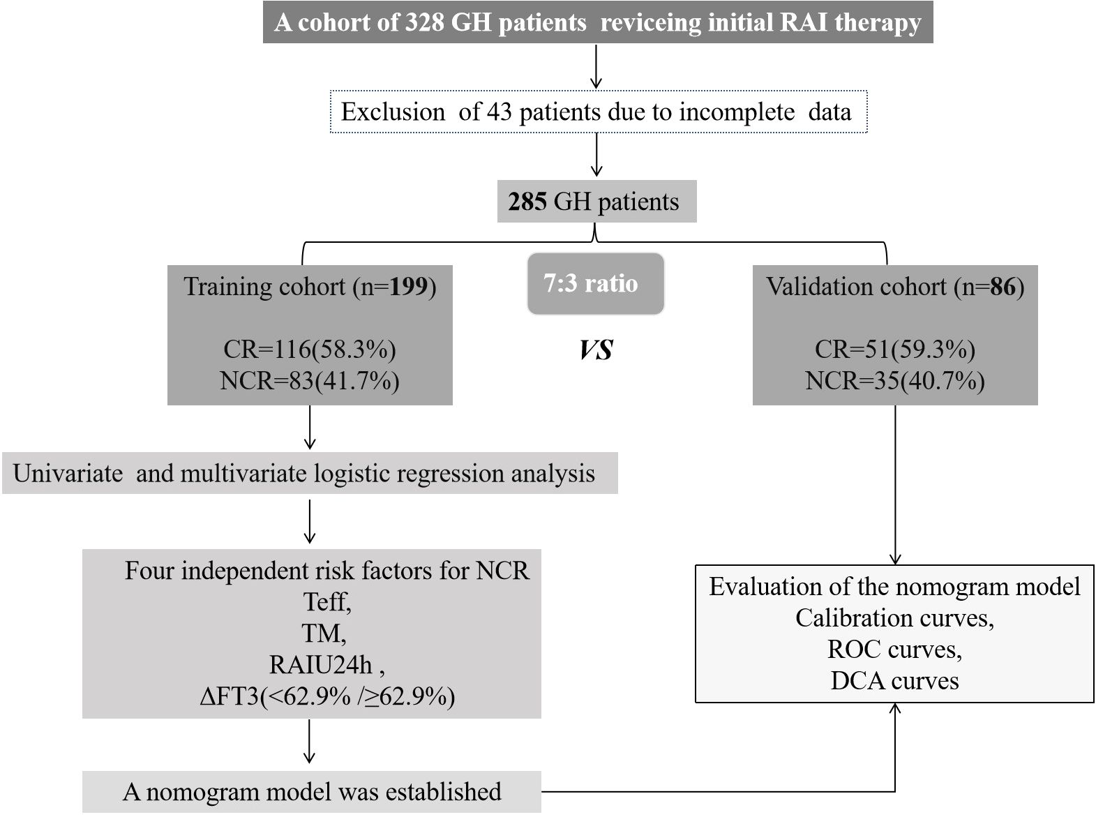 Methods: Data from 285 GH patients undergoing initial RAI therapy were retrospectively analyzed and randomly allocated into training (n=199) and validation (n=86) cohorts at a 7:3 ratio. Univariate followed by multivariate logistic regression identified independent predictors of NCR in the training cohort. These variables informed the construction of a prognostic nomogram model, subsequently verified in the validation cohort through calibration, receiver operating characteristic (ROC) curve, and decision curve analysis (DCA) to assess model reliability, discriminative ability, and clinical utility.