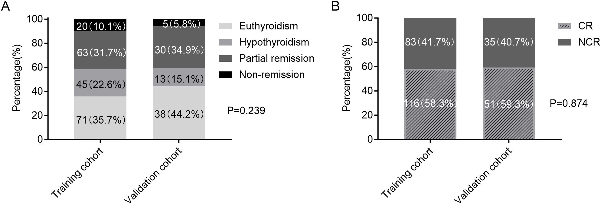 Figure 2. Clinical outcomes following RAI therapy in the training and validation cohorts. (A) Four-category therapeutic response (euthyroidism, hypothyroidism, partial remission, and non-remission). (B) Binary therapeutic response classification (CR vs. NCR). RAI, radioiodine; CR, complete remission; NCR, non-complete remission.
