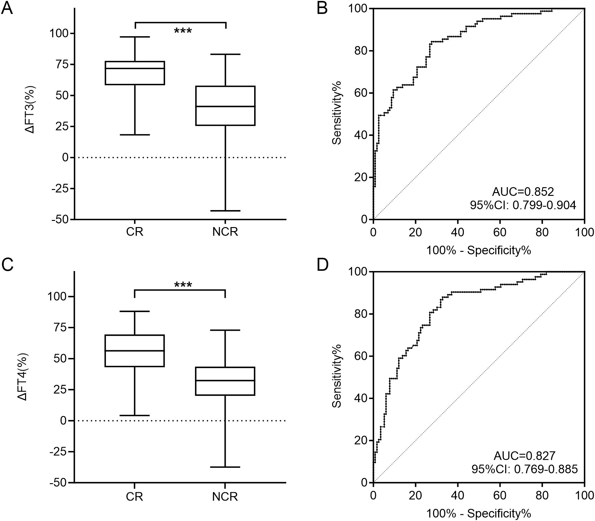 The median ΔFT3 in CR group was 71.8%, while that in the NCR group was only 41.1%. There was a statistical difference between the two groups (U = 1429.0, P < 0.001; Figure 3A). Meanwhile, the median ΔFT4 in CR group was 56.3%, which was also significantly higher than the 32.3% in the NCR group (U = 1667.0, P < 0.001; Figure 3C).