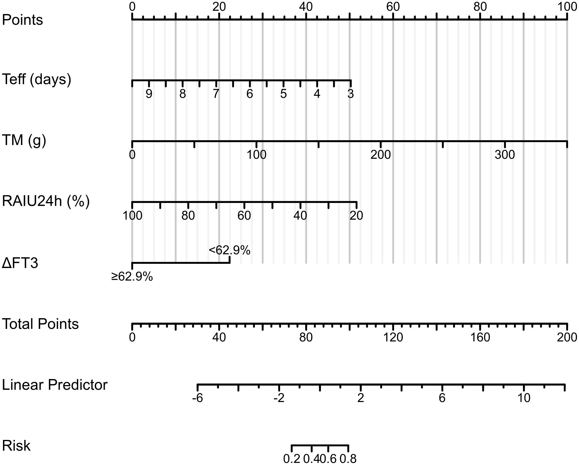Conclusion: TM, RAIU24h, Teff, and ΔFT3 are critical determinants of RAI efficacy in GH. The validated nomogram enables precise NCR risk stratification, facilitating optimized activity prescription to improve remission rates.