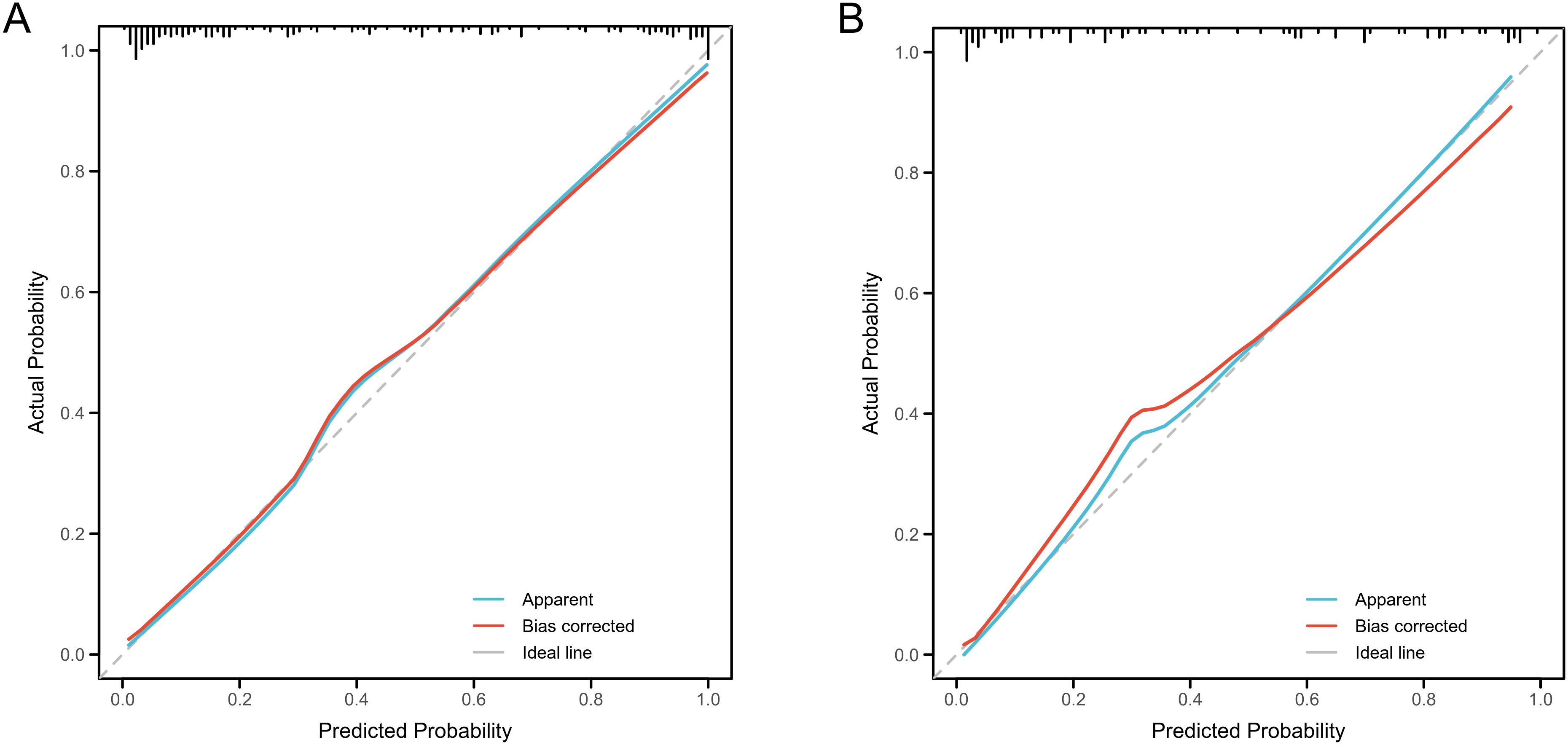 Figure 5. Performance evaluation of the nomogram for predicting non-complete remission (NCR) rates in training and validation cohorts. Calibration plots reveal strong agreement between predicted and observed NCR rates, with curves closely following the ideal reference line (45°diagonal) for both training (A) and validation (B) cohorts.