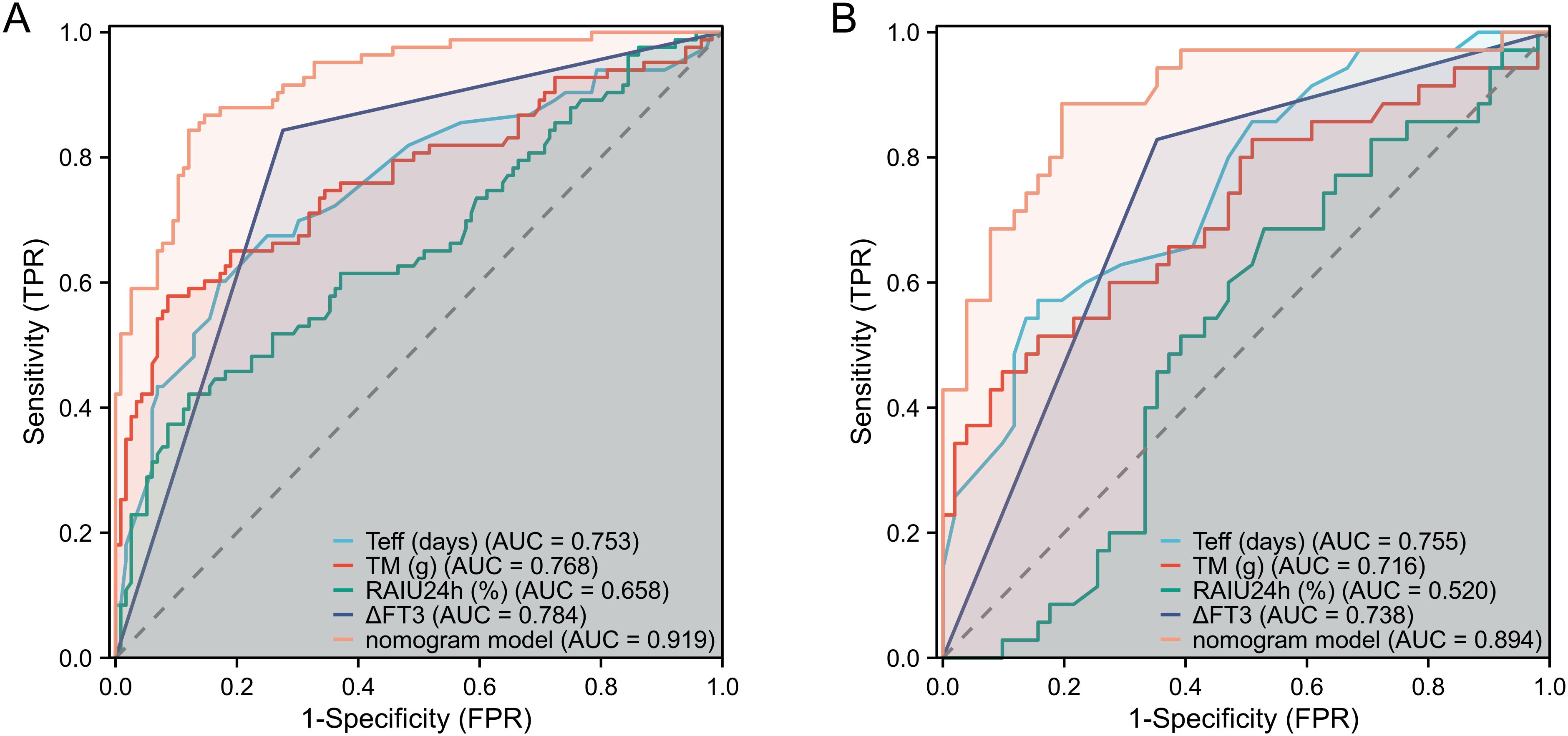 GH patients were randomly allocated into training and cohorts at a 7:3 ratio. Statistical analysis was performed to evaluate the differences in ΔFT3 and ΔFT4 values between treatment response groups within the training cohort using the Mann-Whitney U test. Additionally, receiver operating characteristic (ROC) curve analysis was conducted to assess the predictive performance of these parameters for NCR. Univariate logistic regression analysis was initially performed in the training cohort to identify potential predictors of RAI response, followed by multivariate analysis to determine independent risk factors for NCR. These significant predictors were subsequently incorporated into a prognostic nomogram constructed to estimate the probability of NCR following RAI therapy. The predictive accuracy and discriminative ability of the nomogram were then rigorously evaluated in the validation cohort.