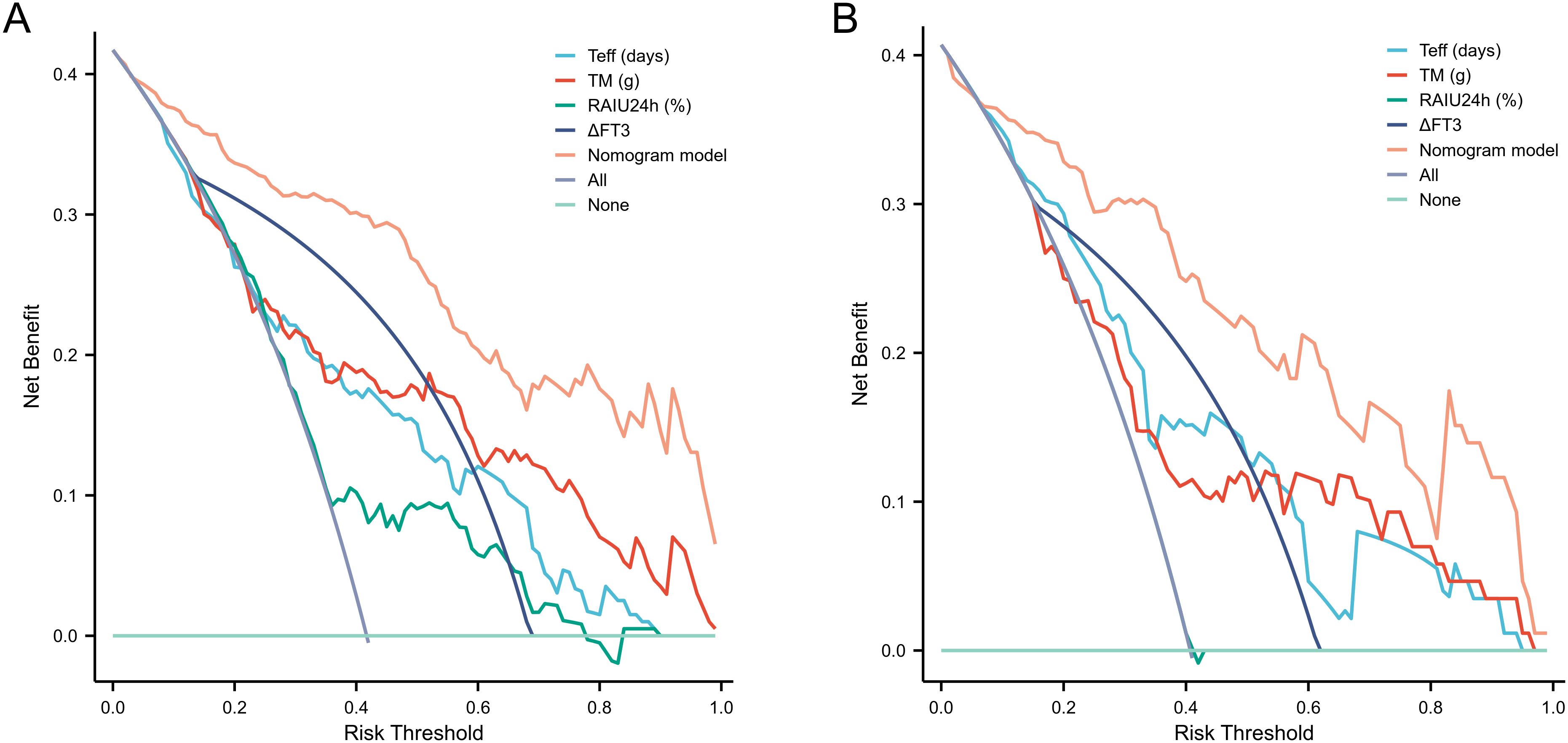 Results: Thyroid mass (TM), 24-hour RAI uptake (RAIU24h), effective half-life (Teff), and free triiodothyronine reduction at 1-month post-therapy (ΔFT3) were independent predictors. The prognostic nomogram integrating these variables exhibited superior discriminative performance in both training (AUC = 0.919) and validation cohorts (AUC = 0.901). Calibration curves confirmed high fidelity between predicted and observed NCR probabilities. DCA demonstrated significant clinical net benefit across threshold probabilities.