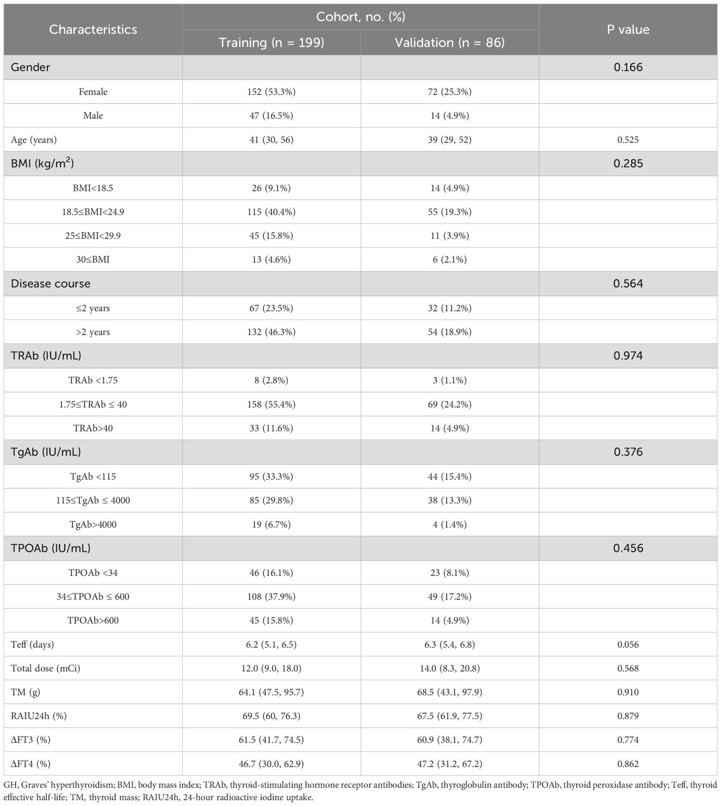 Between January 2021 and December 2023, our institution enrolled 328 GH patients for RAI therapy. Following the study protocol, 43 subjects were excluded due to loss to follow-up or incomplete clinical data, yielding an 86.9% (285/328) eligibility rate for final analysis. The cohort was subsequently randomized into training (n=199) and validation (n=86) subsets at a 7:3 ratio for predictive model development and therapeutic outcome evaluation, as detailed in Figure 1.
