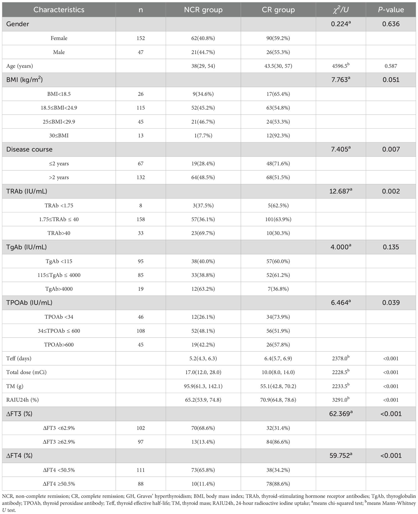 For analytical purposes, patients achieving either euthyroidism or hypothyroidism were classified as the “complete remission” (CR) group, while those with persistent hyperthyroidism (including cases of partial remission and treatment failure) were categorized as the “non-complete remission” (NCR) group (9, 11, 12).
