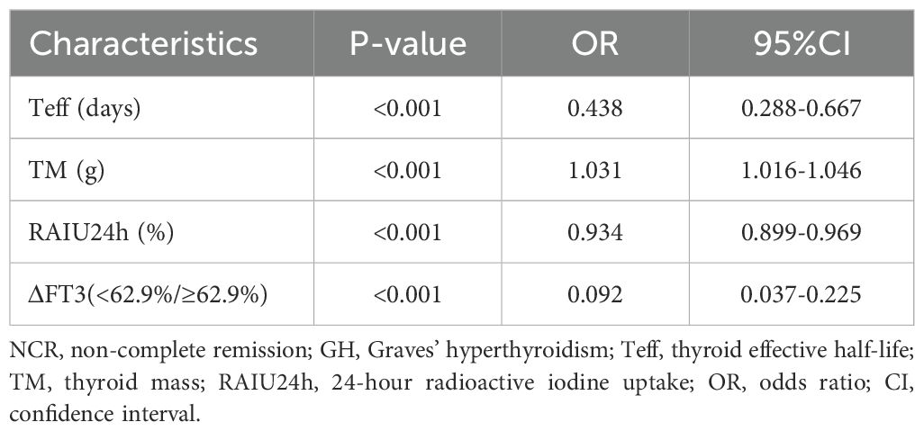 Multivariate analysis revealed that Teff (odds ratio [OR]: 0.438, 95% confidence interval [CI]: 0.288-0.667, P < 0.001), TM (OR: 1.031, 95% CI: 1.016-1.046, P < 0.001), RAIU24h (OR: 0.934, 95% CI: 0.899-0.969, P < 0.001), and ΔFT3(<62.9%/≥62.9%) (OR: 0.092, 95% CI: 0.037-0.225, P < 0.001) were significantly associated with the risk of NCR (Table 3).