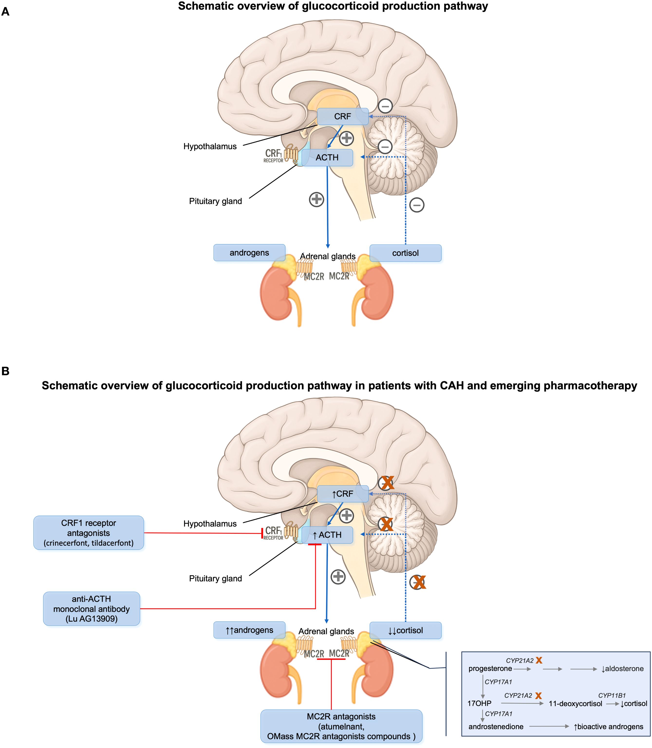 Figure 1. (A) Hypothalamic-pituitary-adrenal (HPA) axis and its hormonal regulation in normal humans. (B) HPA axis and its hormonal regulation in patients with congenital adrenal hyperplasia (CAH) due to 21-hydroxylase deficiency. ACTH, adrenocorticotropic hormone. CRF, corticotropin-releasing factor. MC2R, melanocortin type 2 receptor.