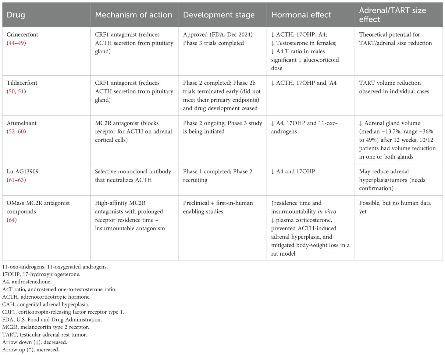 Crinecerfont is a novel orally administered CRF1 antagonist, approved by the U.S. Food and Drug Administration (FDA) in December 2024 for use alongside glucocorticoid therapy to help manage androgen concentrations in both pediatric (aged 4 and above) and adult patients with classic CAH (44, 45). Phase 2 trials in adults (46) and adolescents (47) demonstrated that crinecerfont significantly lowered ACTH, 17OHP and A4 concentrations after 14 days of open-label treatment, justifying that CRF1 antagonism has therapeutic value in CAH. Additionally, reductions in testosterone concentrations in females and in the androstenedione-to-testosterone ratio in males were also observed.
