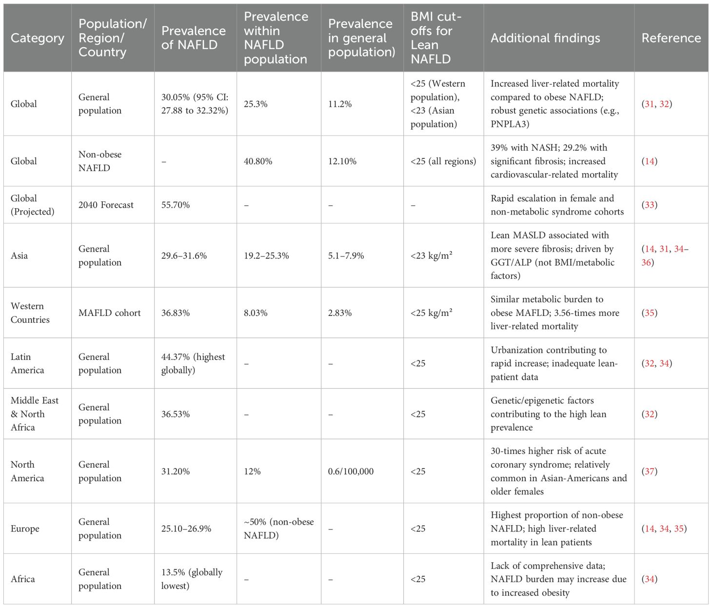 The notion of ‘lean NAFLD’ is mostly determined by the BMI thresholds, which differ markedly between ethnic groups. In individuals of non-Asian heritage, lean NAFLD is often diagnosed in those with NAFLD and a BMI under 25 kg/m² (14). Conversely, for persons of Asian descent, a lower BMI threshold of ≤23 kg/m² is advised to define lean NAFLD (15). These ethnic-specific thresholds are essential, as they recognize that many cultures may encounter metabolic risk and develop fatty liver disease at lower BMI levels than others. This distinction is a clear suggestion from the Centers for Disease Control and Prevention (CDC) and the World Health Organization (WHO), who acknowledge that metabolic risk may present at varying BMI thresholds across various groups. (16). It is also essential to differentiate lean NAFLD from non-obese NAFLD, despite the sometimes-interchangeable usage of both terms. Non-obese NAFLD encompasses a wider classification that includes individuals deemed overweight (BMI ranging from 25-29.9 kg/m² for non-Asians, or 23-27.5 kg/m² for Asians), as well as those who are of lean physique (14). This however, particularly examines the lean phenotype, characterized by a normal-range BMI based on race-specific thresholds (16). The inconsistency in BMI thresholds and the differentiation between lean and non-obese NAFLD in diverse studies (11) provide a considerable obstacle in epidemiological investigation and clinical equivalence. The absence of a universally standardized definition can result in variability in reported prevalence rates and complicate the interpretation of research findings, highlighting the persistent necessity for more consistent diagnostic criteria for research purposes to enhance data comparability across studies.