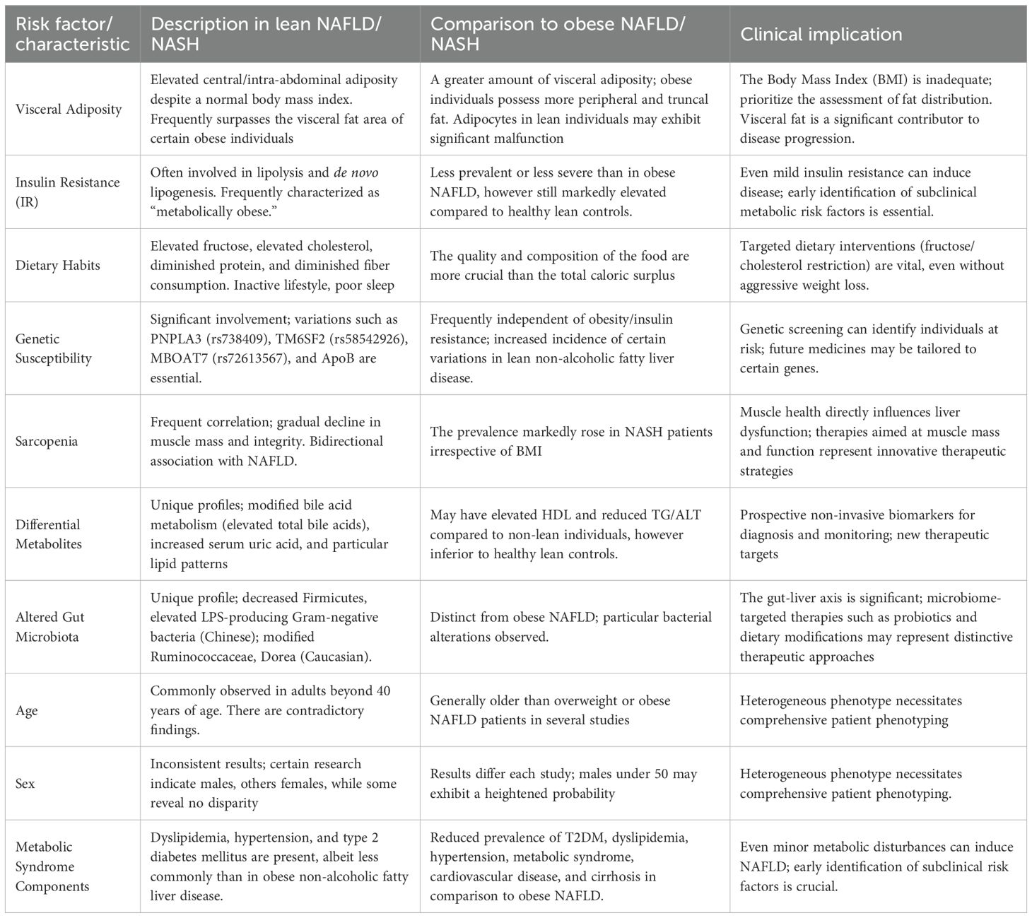 Individuals with lean NAFLD/NASH, while possessing a normal body mass index, are not metabolically healthy and have several underlying risk factors that contribute to the condition. These characteristics often vary in their significance or particular expression relative to those seen in obese NAFLD (Table 2).