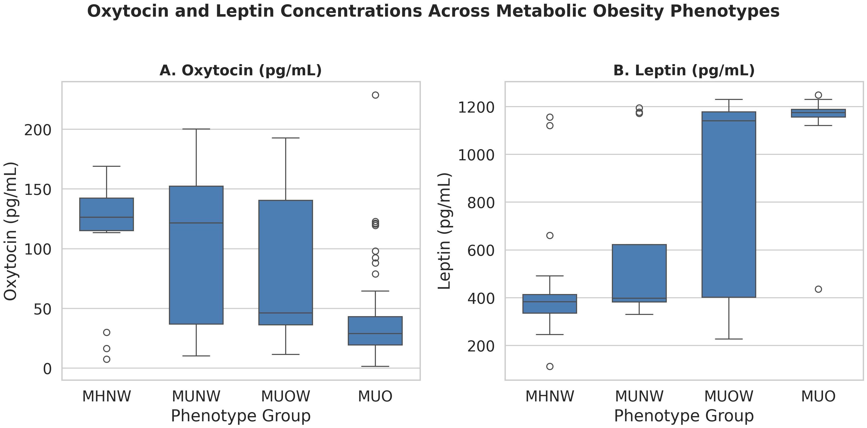Figure 1. Oxytocin and leptin concentrations across metabolic obesity phenotypes. Data are shown as boxplots with medians and interquartile ranges. Kruskal–Wallis p-values are reported; asterisks indicate significant pairwise differences (Dunn’s test with FDR adjustment). MHNW, Metabolically healthy normal Weight; MUNW, Metabolically unhealthy normal weight; MUOW, Metabolically unhealthy overweight MUO, Metabolically unhealthy obesity.