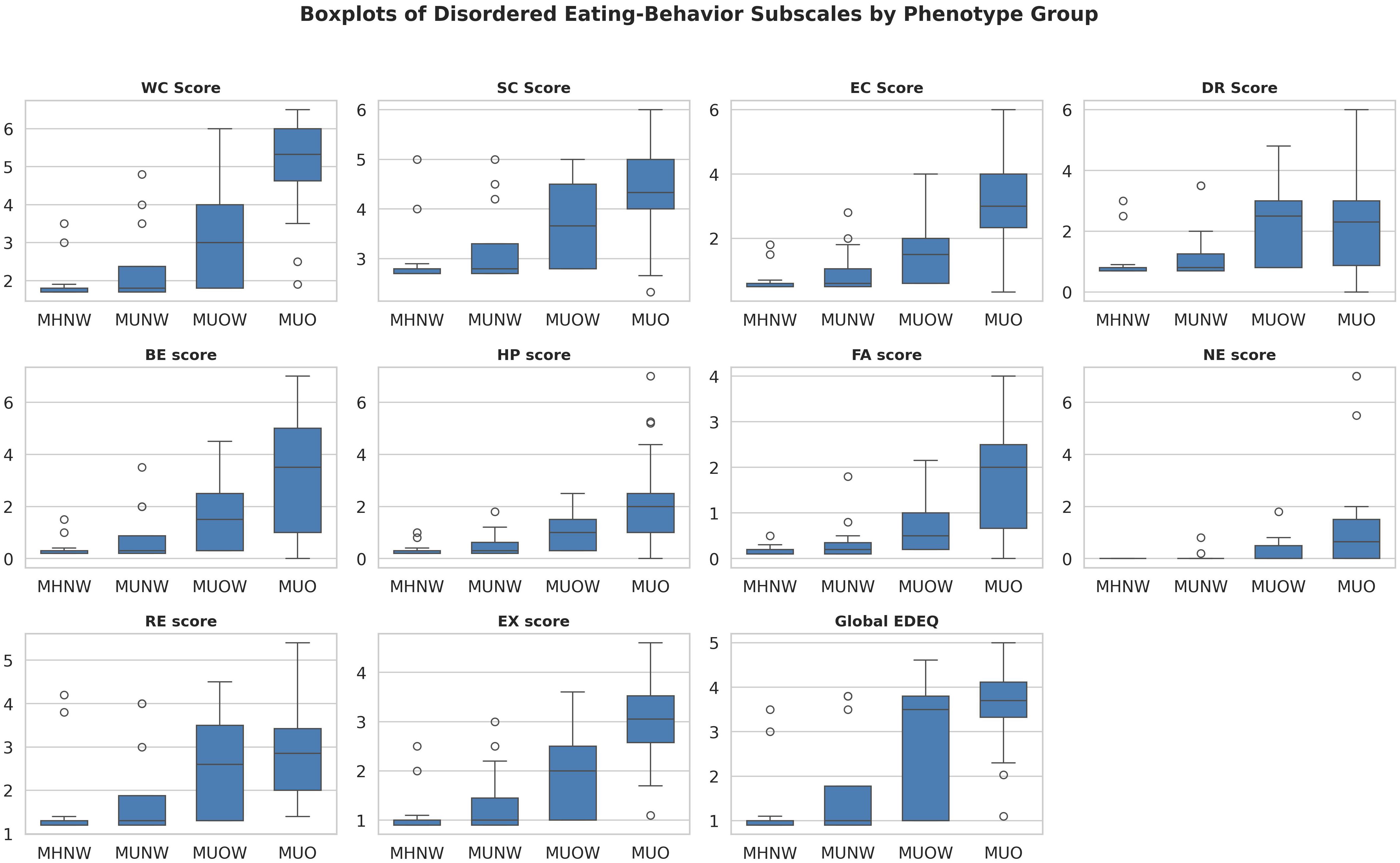 Figure 2. Boxplots of significant disordered eating subscales by metabolic obesity phenotype. Scores are shown for Weight Concern (WC), Shape Concern (SC), Eating Concern (EC), Dietary Restraint (DR), Binge Eating (BE), Hyperphagia (HP), Food Addiction (FA), Night Eating (NE), Restrained Eating (RE), External Eating (EX), and global Eating Disorder Examination Questionnaire (EDE-Q). Groups: MHNW — metabolically healthy normal weight; MUNW — metabolically unhealthy normal weight. MUOW — metabolically unhealthy overweight; MUO — metabolically unhealthy obese; Horizontal lines within boxes indicate medians; boxes denote interquartile range (IQR); whiskers indicate 1.5 × IQR; circles indicate outliers. Kruskal–Wallis p-values were controlled for false discovery rate (FDR < 0.05), with post hoc Dunn’s test for pairwise comparisons.