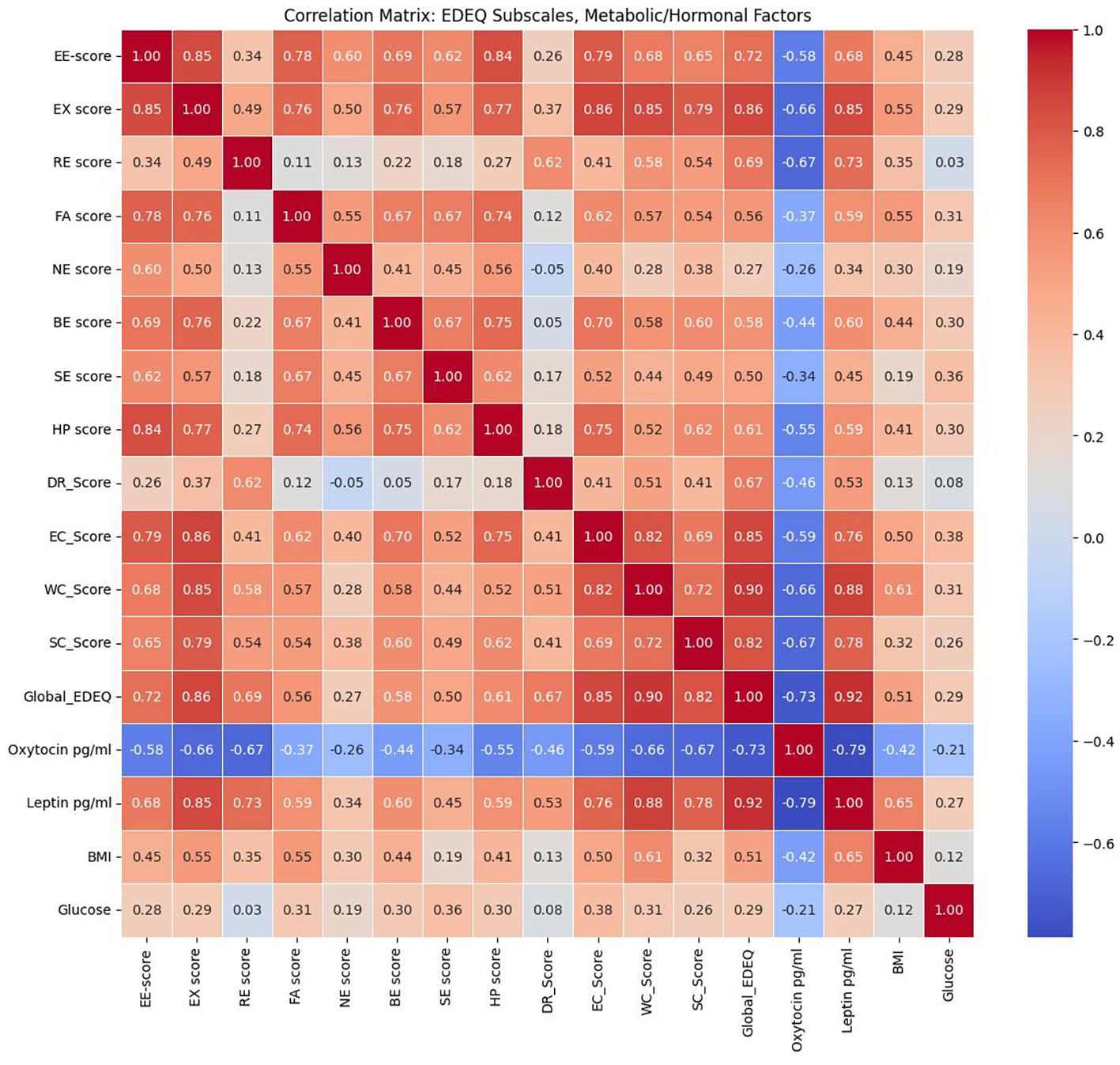 These results, visualized in the heatmap, highlight consistent associations between metabolic/hormonal dysregulation and the severity of disordered eating behaviors (Figure 3).