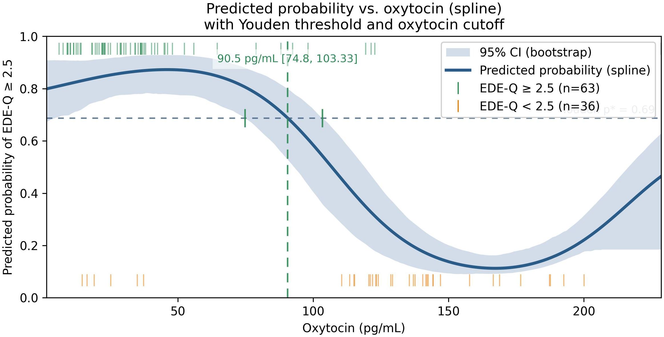 Figure 4. Predicted probability of EDE-Q ≥ 2.5 as a function of plasma oxytocin from a restrictedcubic-spline logistic model (solid line) with 95% bootstrap CI (shaded). The horizontal dotted line shows the Youden-optimal probability threshold (p* = 0.69); the vertical dashed line shows the corresponding oxytocin cutoff (90.5 pg/mL, 95% CI 74.8–103.3). Rug ticks denote observed positives (top) and negatives (bottom). Threshold and CI were derived from out-of-fold predictions and bootstrap mapping, respectively. the Youden threshold and its mapped oxytocin value represent an exploratory operating point derived from out-of-fold predictions; they are not intended as a clinical decision cutoff and would require external validation and prospective evaluation.