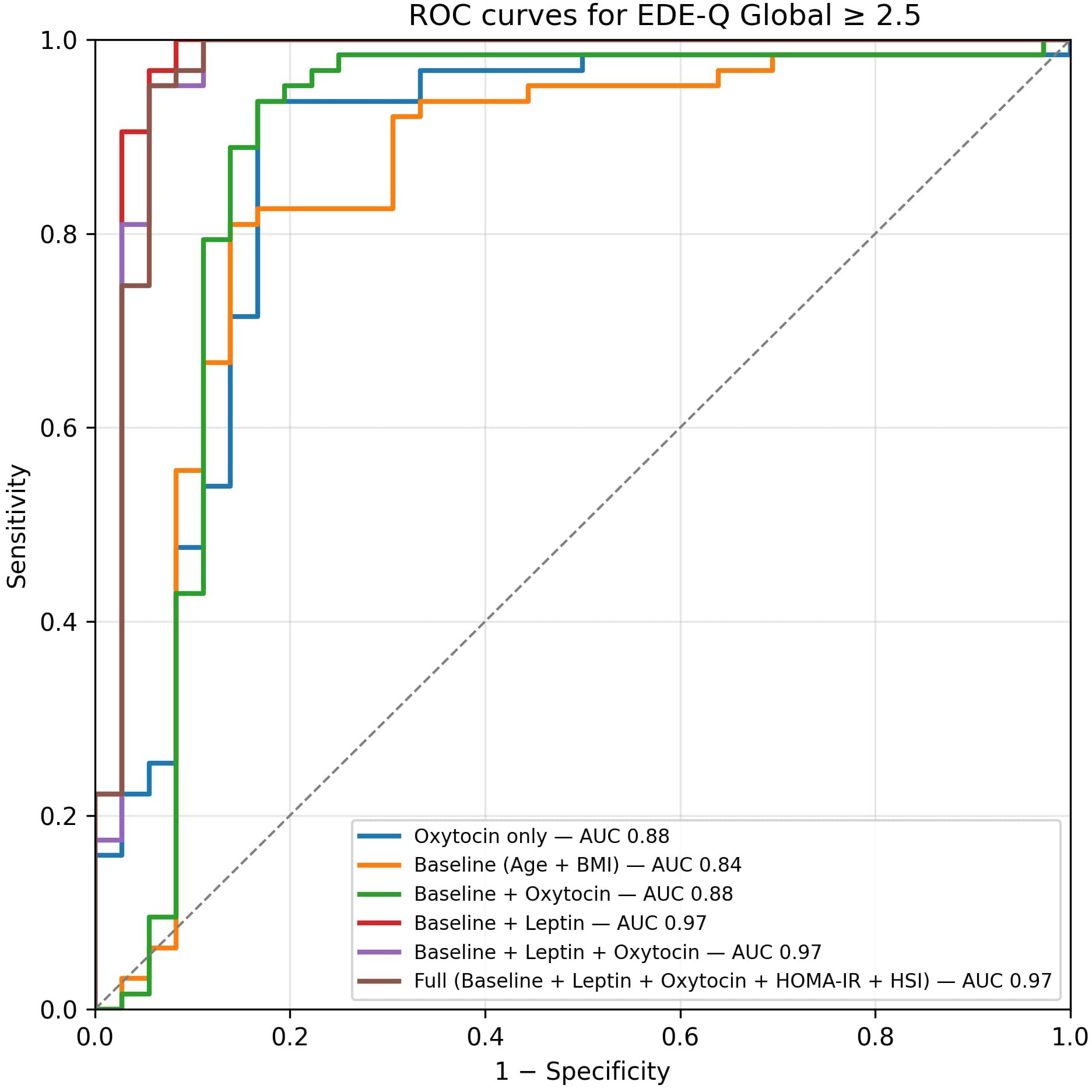 Conclusion: Lower oxytocin is associated with greater disordered-eating severity, but oxytocin is most informative when integrated with metabolic and behavioral markers. A multivariable model substantially improved discrimination and net benefit over oxytocin alone. The ~90.5 pg/mL value is an exploratory operating point rather than a clinical cutoff; external validation and prospective evaluation are needed before translation to practice.