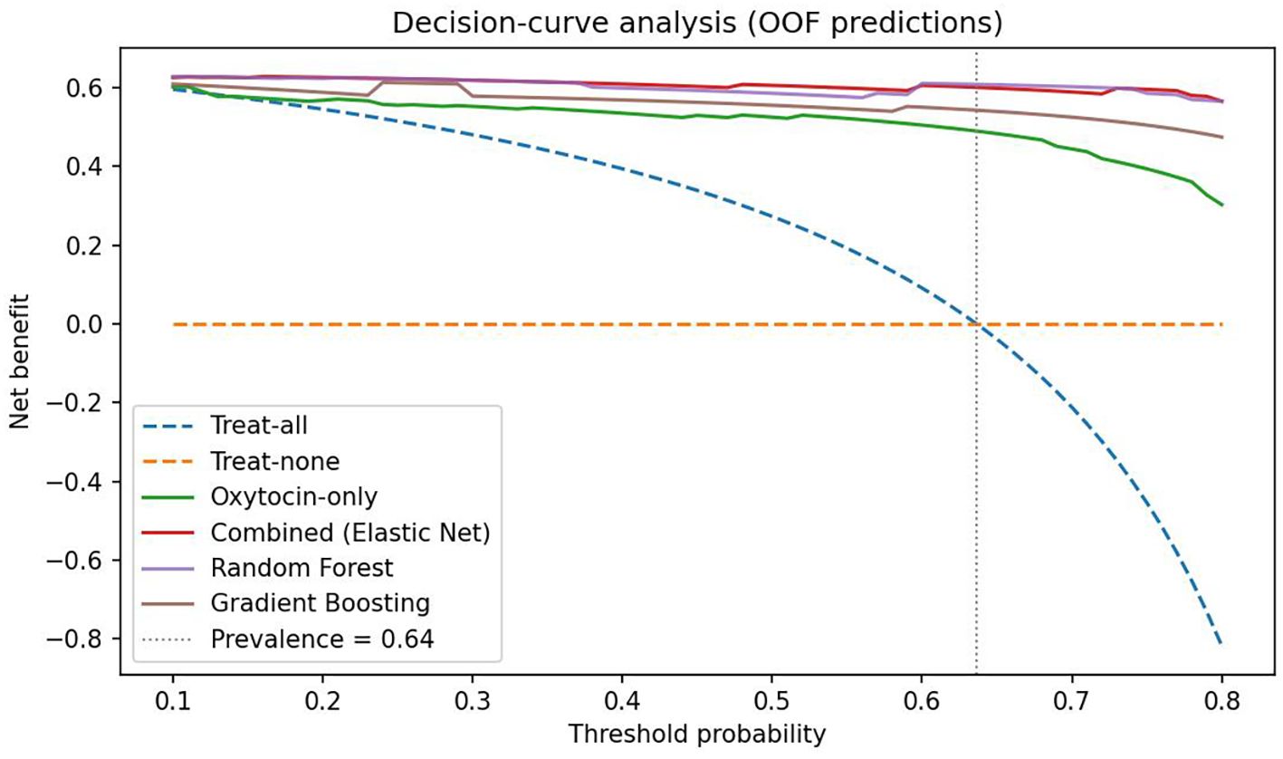 Figure 6. Decision-curve analysis based on out-of-fold predictions. Net benefit is plotted against threshold probability for classifying Global EDE-Q ≥ 2.5. The combined multivariable model (Elastic-Net) and Random Forest deliver the highest net benefit across 0.10–0.80, with Gradient Boosting close behind; the oxytocin-only spline model provides lower benefit at higher thresholds. “Treat-all” and “treat-none” strategies are shown for reference. The vertical dotted line marks the cohort prevalence (0.64). The red dot marks the Youden-optimal operating point for the combined model (p* = 0.77 from the OOF ROC), where sensitivity and specificity are jointly maximized.