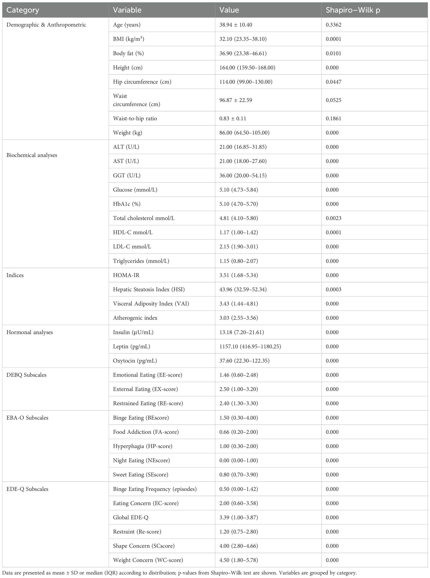 HOMA-IR was elevated (median 3.51, IQR: 1.68–5.34), alongside increased hepatic steatosis index (HSI: 43.96, IQR: 32.59–52.34) and visceral adiposity index (VAI: 3.43, IQR: 1.44–4.81). Hormonal analysis revealed hyperleptinemia and high inter-individual variability in oxytocin (median 37.60 pg/mL, IQR: 22.30–122.35).