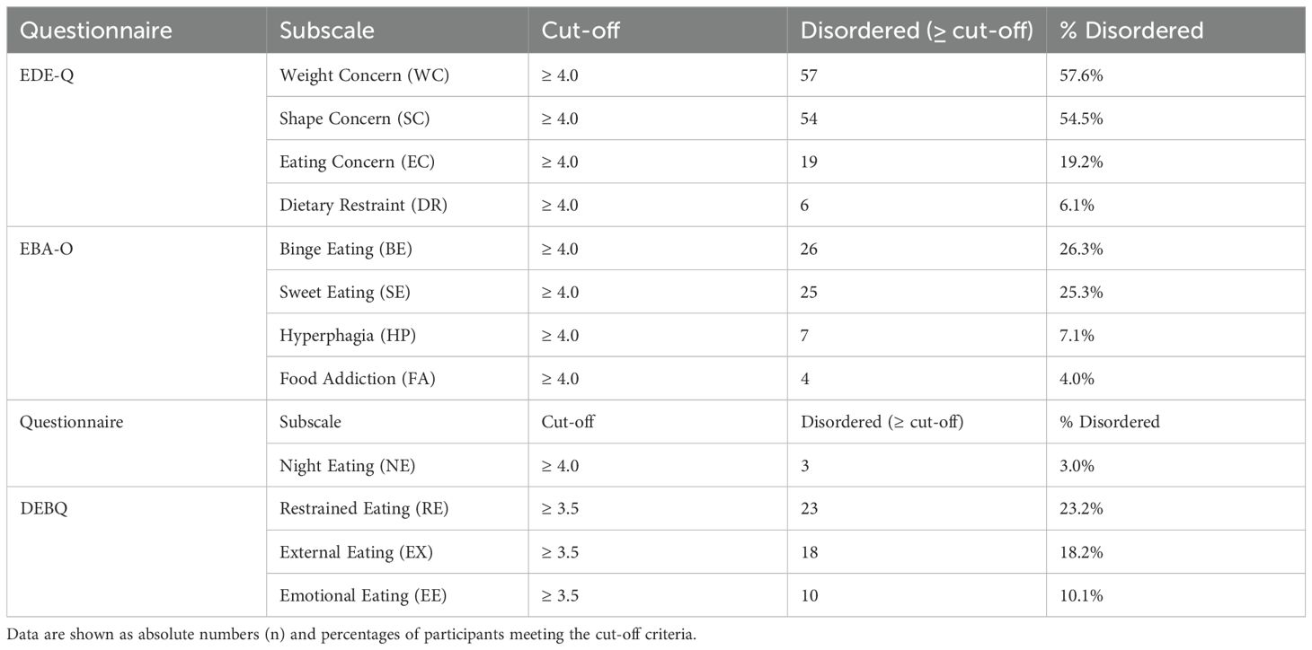 Based on validated cut-off scores, the most prevalent disordered eating patterns were Weight Concern (57.6%) and Shape Concern (54.5%) on the EDE-Q, followed by Binge Eating (26.3%) and Sweet Eating (25.3%) on the EBA-O. Less common behaviors included Hyperphagia (7.1%), Food Addiction (4.0%), and Night Eating (3.0%). In the DEBQ subscales, Restrained Eating was present in 23.2% of participants, External Eating in 18.2%, and Emotional Eating in 10.1% (Table 2).