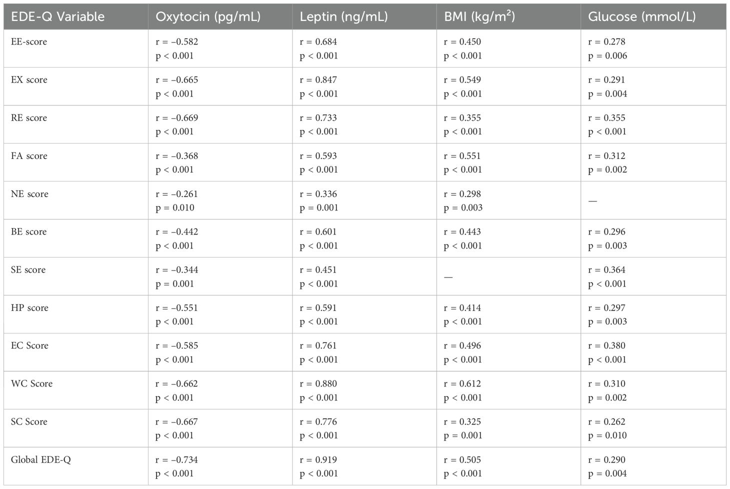 A heatmap of Spearman correlation coefficients (Figure 3) revealed strong intercorrelations among the EDE-Q subscales and the Global EDE-Q score, reflecting the internal consistency of this instrument. Notably, Global EDE-Q demonstrated strong positive correlations with EE-score, EX score, RE score, EC_Score, WC_Score, and SC_Score.