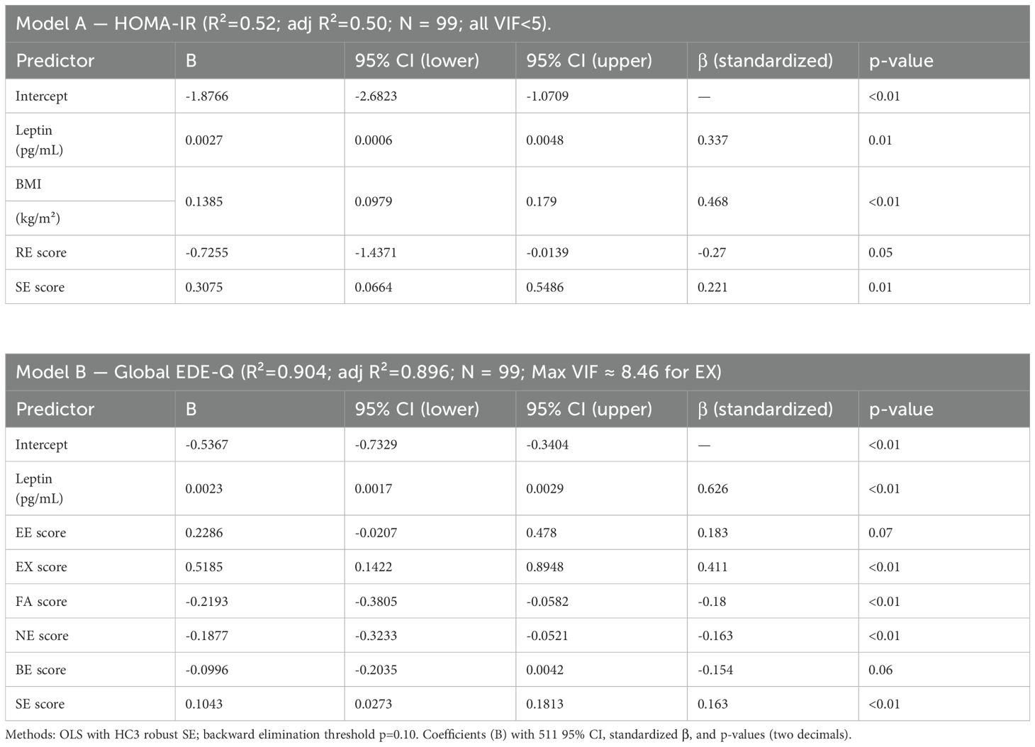 Ordinary least squares models with HC3 robust standard errors were used to identify independent predictors of insulin resistance (HOMA-IR) and disordered eating severity (global EDE-Q). Candidate predictors included plasma oxytocin, leptin, body mass index (BMI), visceral adiposity index (VAI), and eating behavior subscales (emotional, external, restrained, food addiction, night eating, binge eating, sweet eating, and hyperphagia). Predictors were retained using backward elimination with a pre-specified threshold of p < 0.10, and model assumptions were verified through residual diagnostics (Table 4).