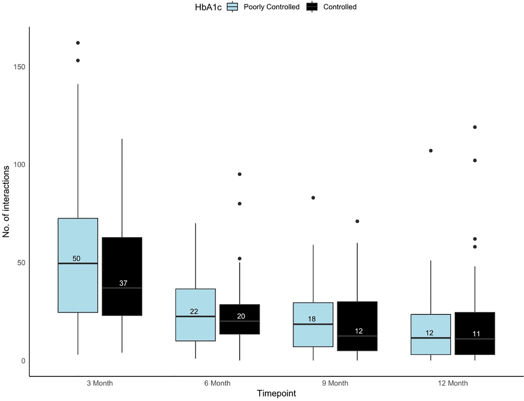 Both the groups demonstrated a reduction in HbA1c over time, with the HbA1c at 12 months being 6.59% (95% CI: 6.29–6.89) in the poorly controlled group and 6.26% (95% CI: 5.96–6.56) in the controlled group. Also, there was no statistically significant difference in glycemic control at 12 months between the two groups (P = 0.205) adjusted for their baseline HbA1c level and the total number of virtual interactions. A higher number of virtual interactions was associated with improved glycemic control (β = –0.007; 95% CI: –0.011 to –0.002; p = 0.003). This association remained significant after adjusting for age, BMI, medication use, and glycemic control group (β = –0.006; 95% CI: –0.010 to –0.002; p = 0.001).