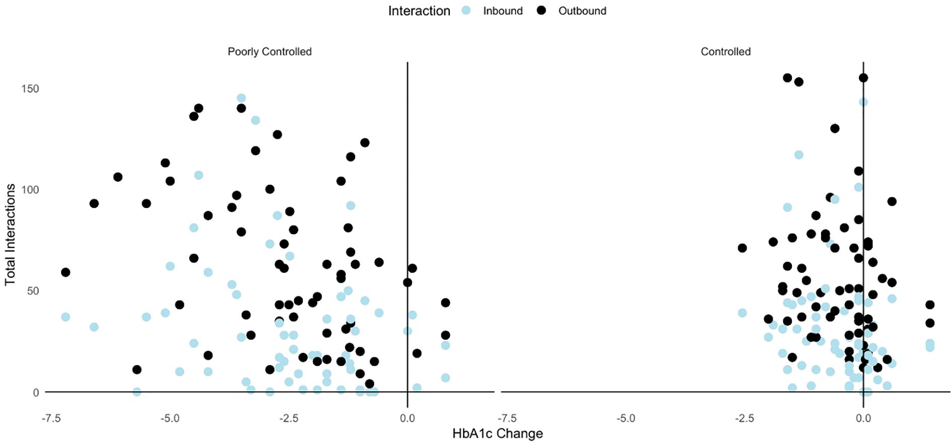 Figure 2. Scatterplot showing correlation between inbound interactions and outbound interactions and the change in HbA1c levels among controlled and poorly controlled groups.