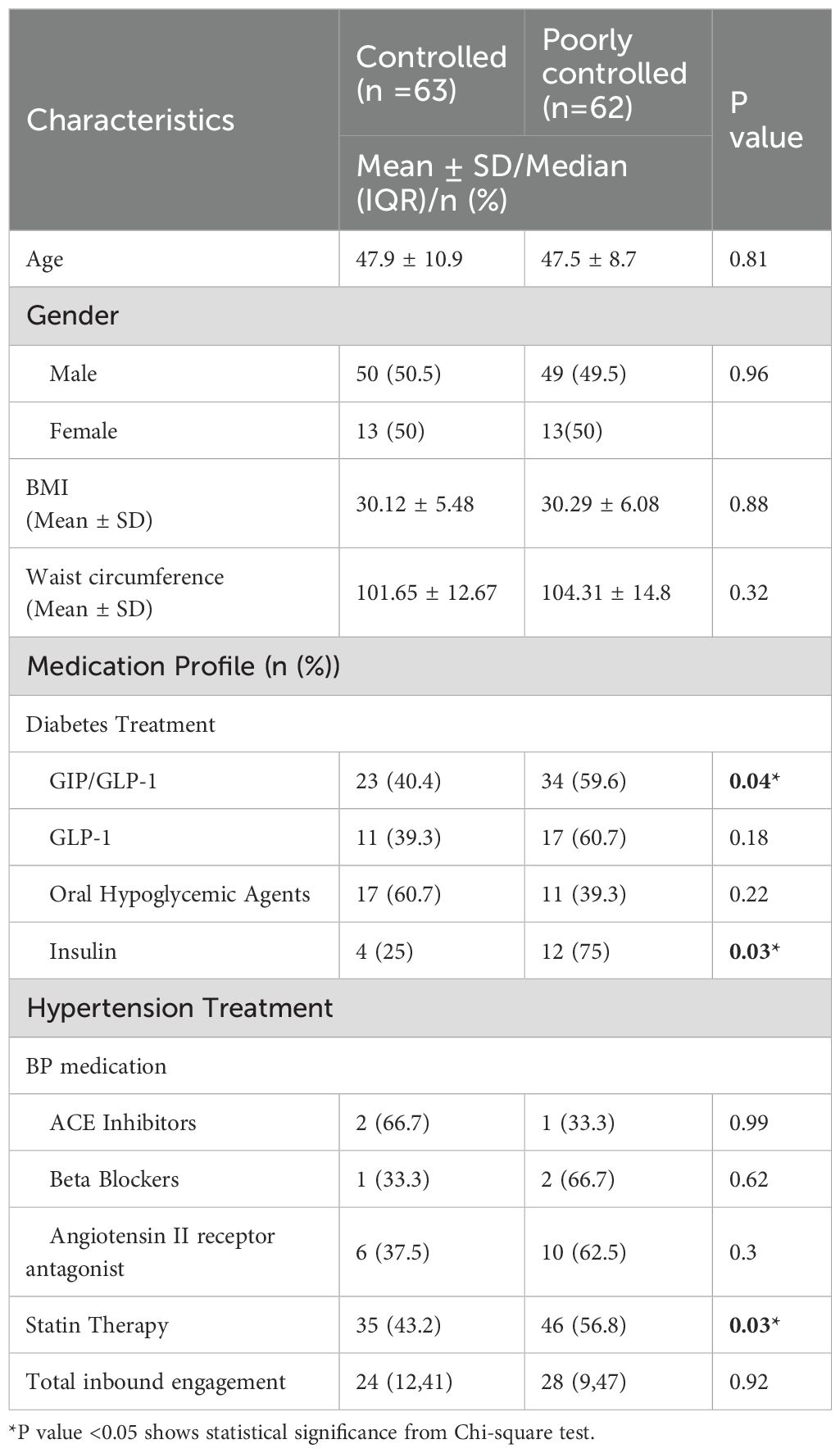 Baseline characteristics between controlled (n=63) and poorly controlled (n=62) groups were compared, the age and the gender distribution were similar between the two groups (Table 1). However, differences were observed in medication profiles, with participants in the poorly controlled group more likely to be on GIP/GLP-1 receptor agonists (59.6%), insulin therapy (75%) and statin therapy (56.8%) compared to the controlled group. No significant differences were noted in hypertension treatment, including the use of ACE inhibitors, beta-blockers, or angiotensin II receptor antagonists. Median total inbound engagement in the portal during the study period was comparable between the groups (p =0.92).