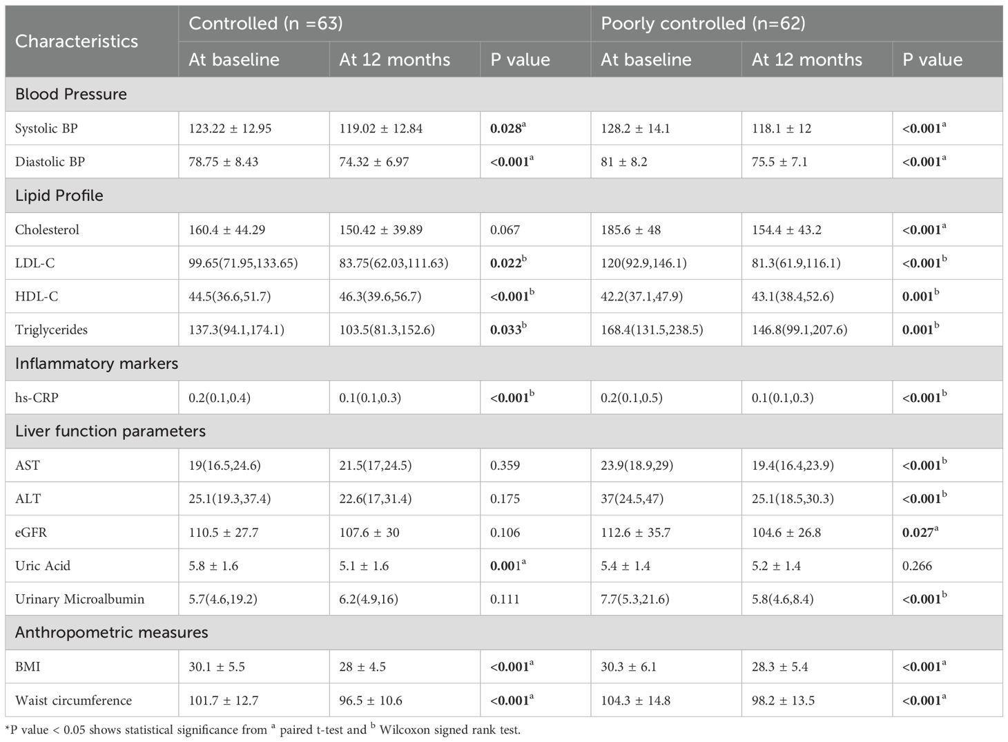 Table 2. Clinical and anthropometric parameters at baseline vs 12 months among controlled and poorly controlled T2DM patients (n =125).