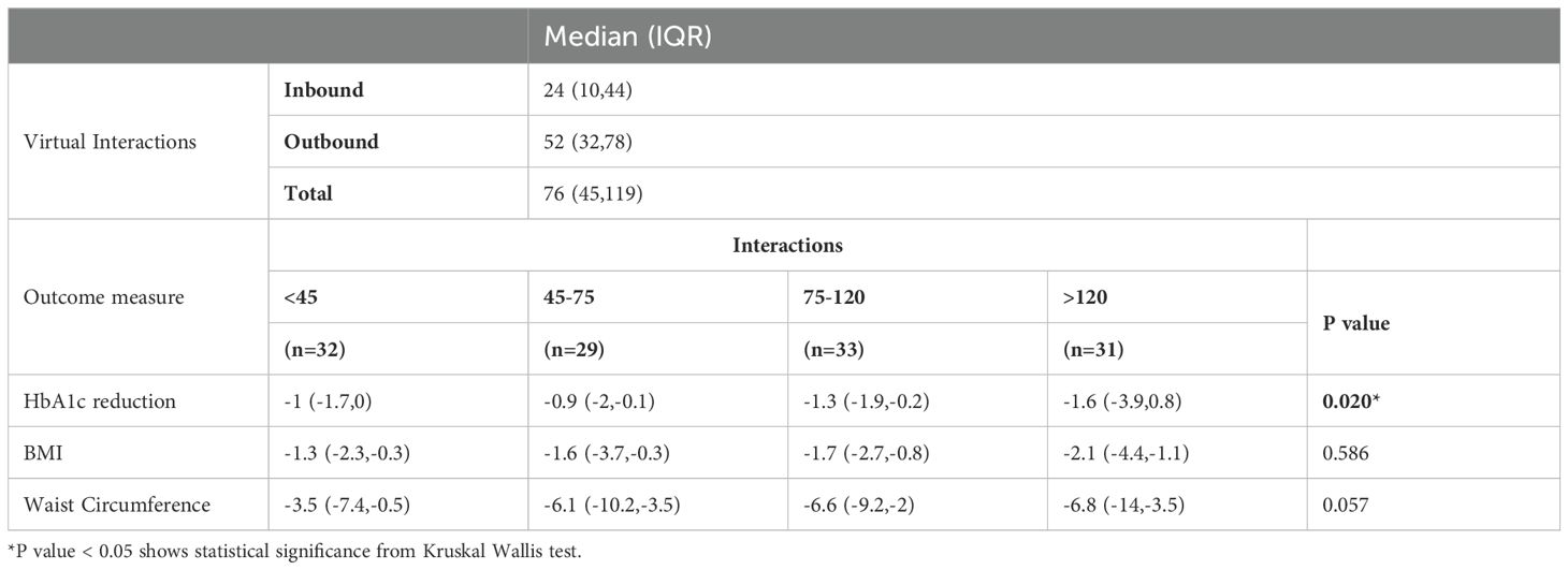 Patients were divided into four groups based on their total number of interactions (<45, 45–75, 75–120, and >120). Higher interaction levels were associated with greater reductions in HbA1c, with the most significant decrease observed in the >120 interactions group (-1.6 [-3.9, 0.8], p = 0.02). (Table 3) Reductions in BMI and waist circumference were directionally greater in groups with higher interactions, though these differences are not statistically significant (p = 0.586 and p= 0.057 respectively).