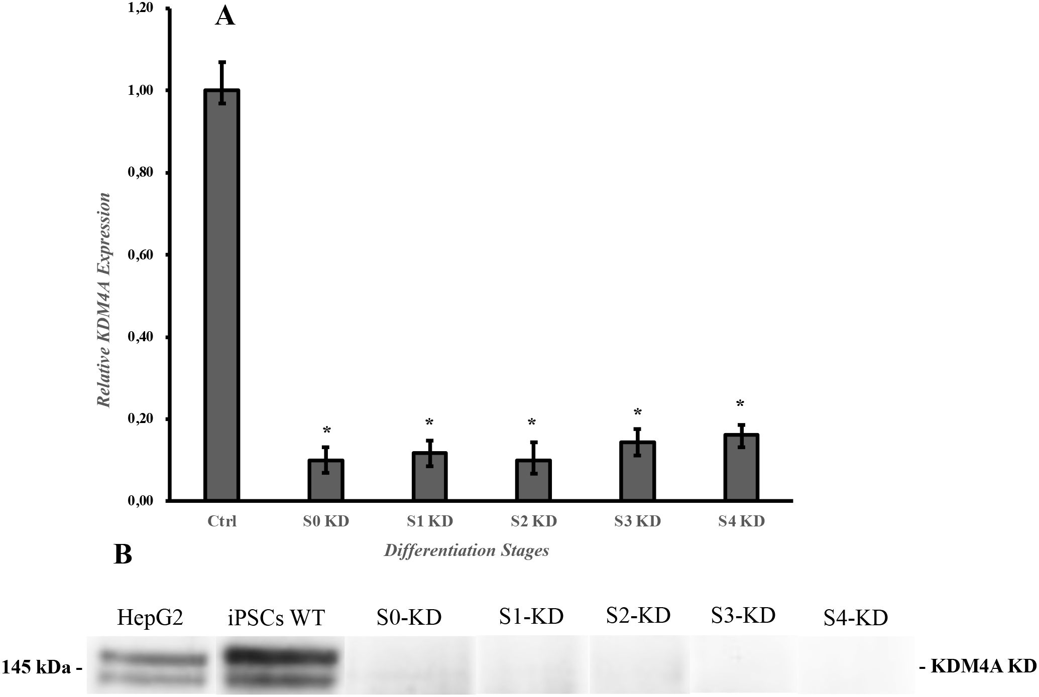Figure 1. Expression of the KDM4A protein after lentiviral infection. (A) qPCR results of the knockdown of the protein. Expression data are normalized to the Ctrl (b-actin, transcript level). Each experiment was performed in triplicate. Bars under the same symbol (*) are statistically different under the two-tailed, unpaired Student´s t-test compared to the Ctrl expression level. *p < 0.05. (B) KDM4A protein knockdown during the differentiation protocol. Proteins were extracted at the end of each differentiation stage and detected using specific antibodies against KDM4A. HepG2 and iPSCs WT (wild type) were used as controls. S0-KD, Stage 0 knockdown; S1-KD, Stage 1 knockdown; S2-KD, Stage 2 knockdown; S3-KD, Stage 3 knockdown; S4-KD, Stage 4 knockdown; KDM4A-KD, Histone lysine demethylase 4A knockdown.