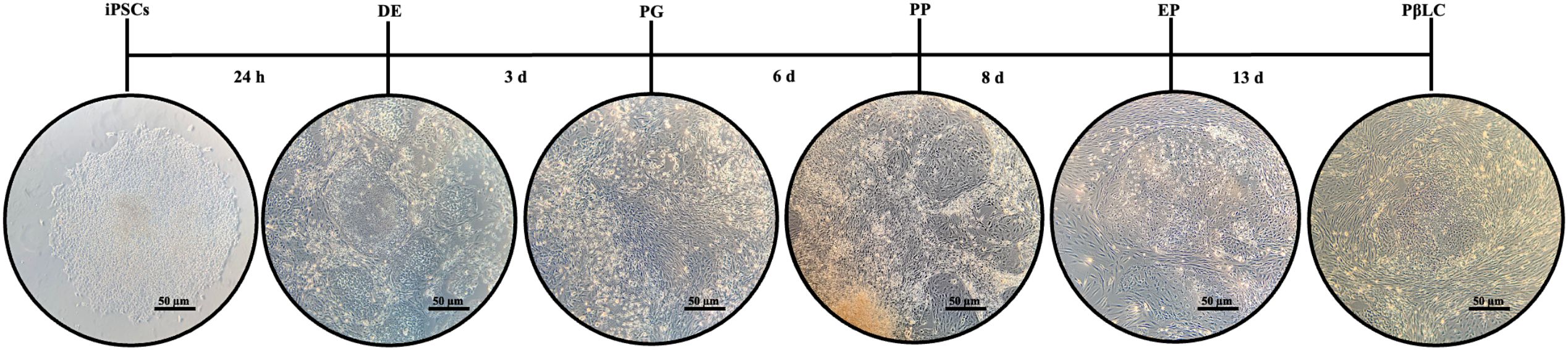 Figure 2. Schematic representation of the differentiation process of the iPSCs KDM4A knockdown (iPSCs-KD) to pancreatic β-like cells (PβLCs). iPSCs were cultured in a 12-well plate coated with vitronectin XF™ in a sequential protocol for 13 days. The mTeSR1™ was supplemented with different cofactors and small molecules. Images were captured with a phase contrast microscope (ZEISS AX10). DE, Definitive endoderm; PG, Pancreatic gut tube; PP, Pancreatic progenitor; EP, Endocrine progenitor; PβLC, Pancreatic beta-like cell; d, days. Black bar 50 µm.