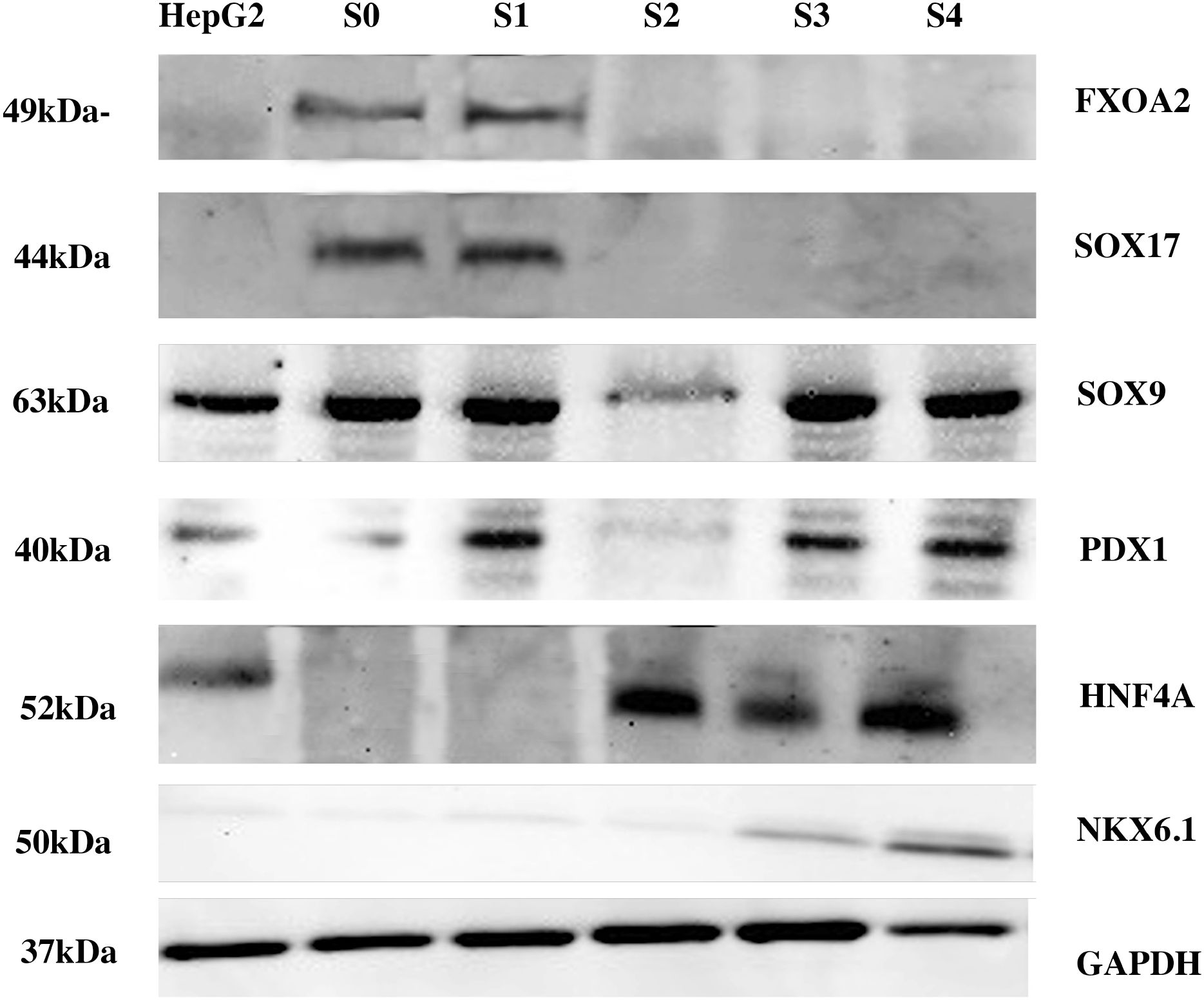 Figure 3. Western blot result of the differentiation process. The figure represents all the proteins detected during different differentiation stages of the iPSCs KDM4A-KD. Proteins are detected individually at each differentiation stage. A HepG2 cell line was used as the control for the experiment. The approximate molecular weight of the protein (kDa) is shown. SOX17–44 kDa; FOXA2–49 kDa; HNF4A 52 kDa; PDX1–40 kDa; SOX9–63 kDa; PTF1A 42 kDa; NKX6.1–50 kDa. S0, Stage 0; S1, Stage 1; S2, Stage 2; S3, Stage 3; S4, Stage 4.