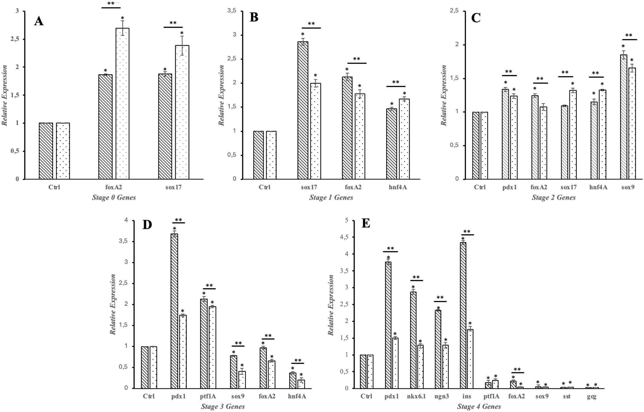 Figure 4. Gene expression during differentiation. Line bars represent gene expression in WT iPSCs throughout the differentiation protocol, while dotted bars represent gene expression in KDM4A-KD iPSCs. Expression levels were normalized to the control (β-actin transcript). Each experiment was performed in triplicate. Bars marked with the same symbol (*) indicate a statistically significant difference compared to the control group (two-tailed, unpaired Student’s t-test, *p < 0.05). Bars marked with the same symbol (**) indicate a statistically significant difference between the two groups (WT and KDM4A-KD, two-tailed, unpaired Student’s t-test, **p < 0.05). (A) Stage 0 (DE); (B) Stage 1 Gene expression (PG); (C) Stage 2 Gene expression (PP); (D) Stage 3 Gene expression (EP); (E) Stage 4 Gene expression (PβLC). foxA2, Forkhead box A2; sox17, SRY-box transcription factor 17; hnf4A, Hepatocyte nuclear factor 4 alpha; pdx1, Pancreatic and duodenal homeobox 1; sox9, SRY-box transcription factor 9; nkx6.1, Nk6 homeobox 1 protein; ngn 3, Neurogenin-3; ins, Insulin; ptf1A, Pancreas associated transcription factor 1A; sst, Somatostatin; cgc, Glucagon.