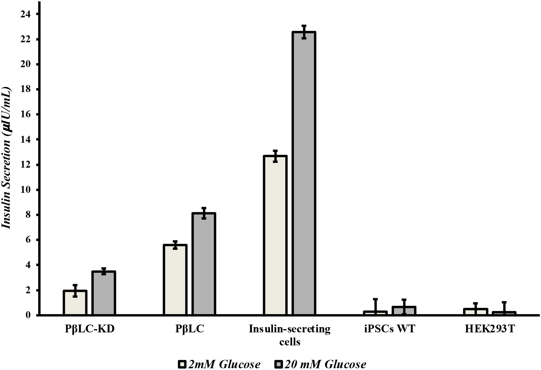 Figure 5. ELISA measurements of human insulin. Basal insulin was measured one-hour post-treatment with 2 mM glucose (close Barr). Stimulated insulin was measured one-hour post-treatment with 20 mM glucose (open Barr). All measurements were performed by triplicate. PβLC-KD, pancreatic β-like cells KDM4A-KD; PβLC, pancreatic β-like cells; Insulin-secreting cells (INS823/13); iPSC WT, Induced pluripotent cells without differentiation; HEK293T, Human embryonic kidney cells.