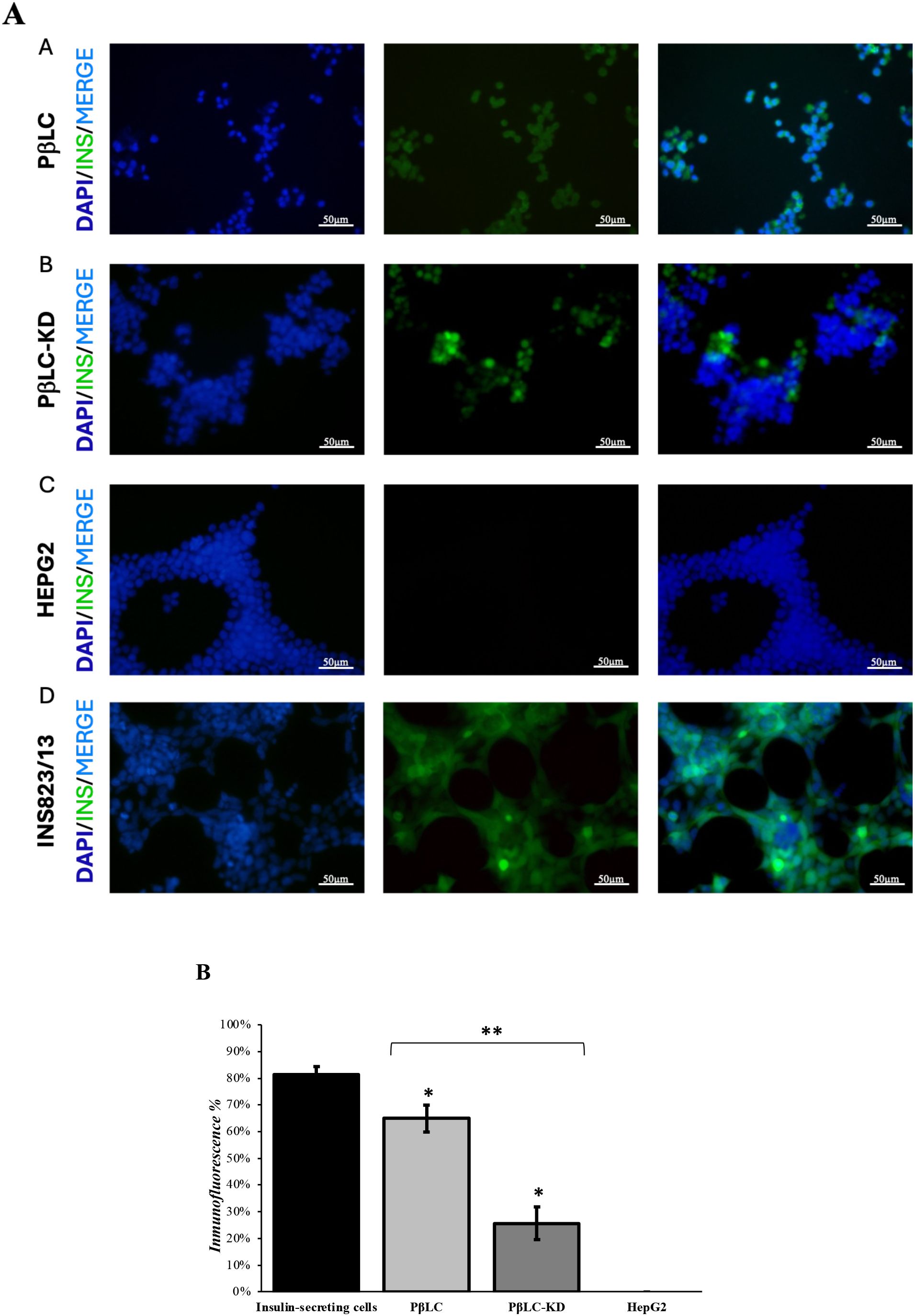 Figure 6. (A) Immunofluorescence staining showing insulin (green), DAPI (blue), and merge pictures. The results showed that PβLC and PβLC-KD express insulin in response to glucose. However, insulin production in response to glucose by PβLC-KD was lower than that of PβLC, which would be consistent with the results obtained by qRT-PCR. Scale bar = 50 µm. All images were obtained on an Eclipse Ni-E microscope (Nikon) and analyzed with ImageJ software (National Institutes of Health) at 80 ms of exposure. (B) Insulin expression percentage. The fluorescence expressed by insulin was normalized to that expressed by the nucleus. Bars under the same symbol (*) are statistically different under the two-tailed, unpaired Student’s t-test (p < 0.05*; p < 0.05** n = 3). A. PβLC: Pancreatic β-like cells; B. PβLC-KD: Pancreatic β-like cells KDM4A-KD. C. HepG2: Hepatoblastoma cell line (negative control). D. INS823/13: Rat insulinoma cell line (insulin-secreting cells).