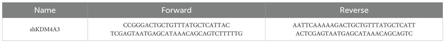 The KDM4A knockdown efficiency was evaluated using three shRNA plasmids (shKDM4A1, shKDM4A2, and shKDM4A3) constructed with a GFP shRNA tet pLKO puro. The plasmids were delivered into 20b iPSCs via lentiviral transduction and cultured in mTeSR1™ for 48 h. After that, the medium was changed and supplemented with doxycycline (1 µg/mL) for 48 h, and then positive clones were selected using puromycin (1µg/mL) for another 48 h. The KDM4A expression was quantified by real-time PCR. Based on the mRNA expression, shKDM4A3 (Table 1) showed the highest inhibition effect of KDM4A (data not shown).