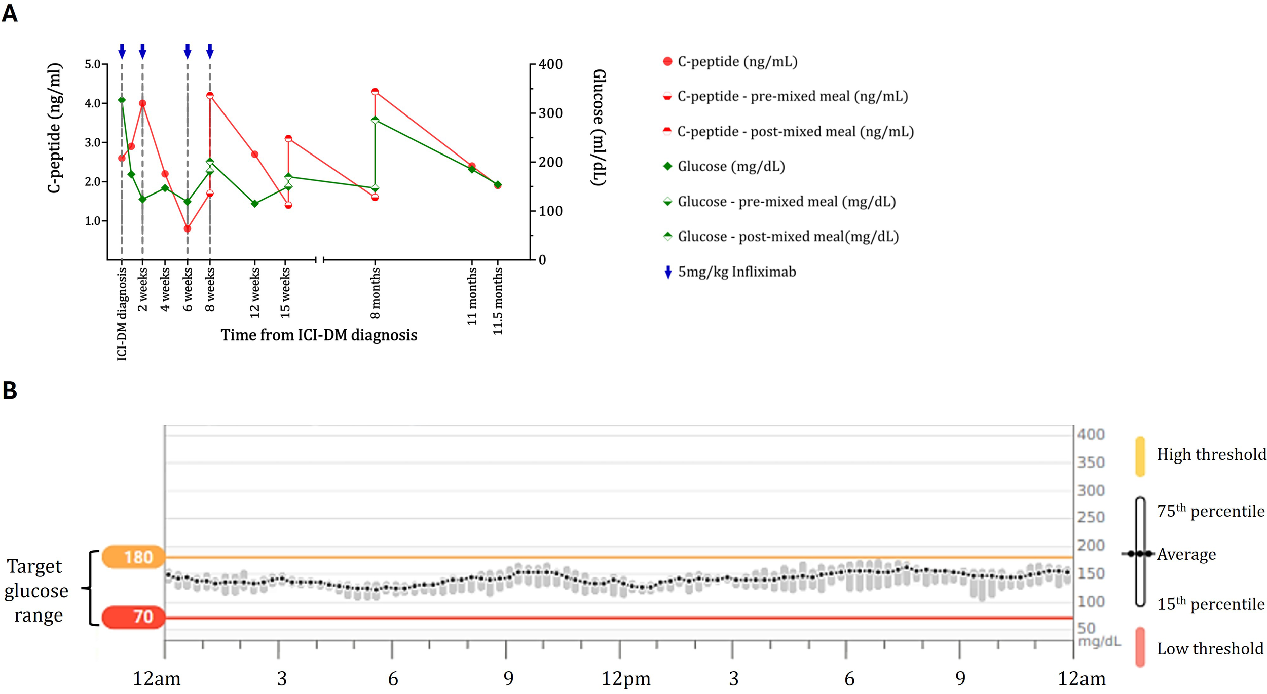 Maintenance of beta-cell function and diabetes control in the case 1 ICI-DM patient treated with infliximab. (A) C-peptide (red) and blood glucose (green) data for the case 1 patient show maintenance of C-peptide on both random checks and response to a mixed meal. For the response to the mixed meal, baseline glucose and C-peptide levels (diamond and circle filled on the bottom, respectively) 2 h after drinking Ensure Plus (diamond and circle filled on the top) are shown. Blue arrows indicate doses of infliximab. C-peptide levels and responses are maintained for almost a year after diagnosis and initiation of infliximab. (B) Continuous glucose monitoring data for the case 1 patient 168 days following diabetes diagnosis. Blood glucose data for a 2-week period showing average blood glucose (with 15th and 75th percentiles) over 24 h while the patient was on glargine 10 units and lispro 3 units before meals. The patient had excellent control (93% of blood glucose levels are in the target range) without significant blood glucose fluctuations or lows typically observed in patients with ICI-DM. Yellow line = high threshold (180 mg/dL); red line = low threshold (70 mg/dL).