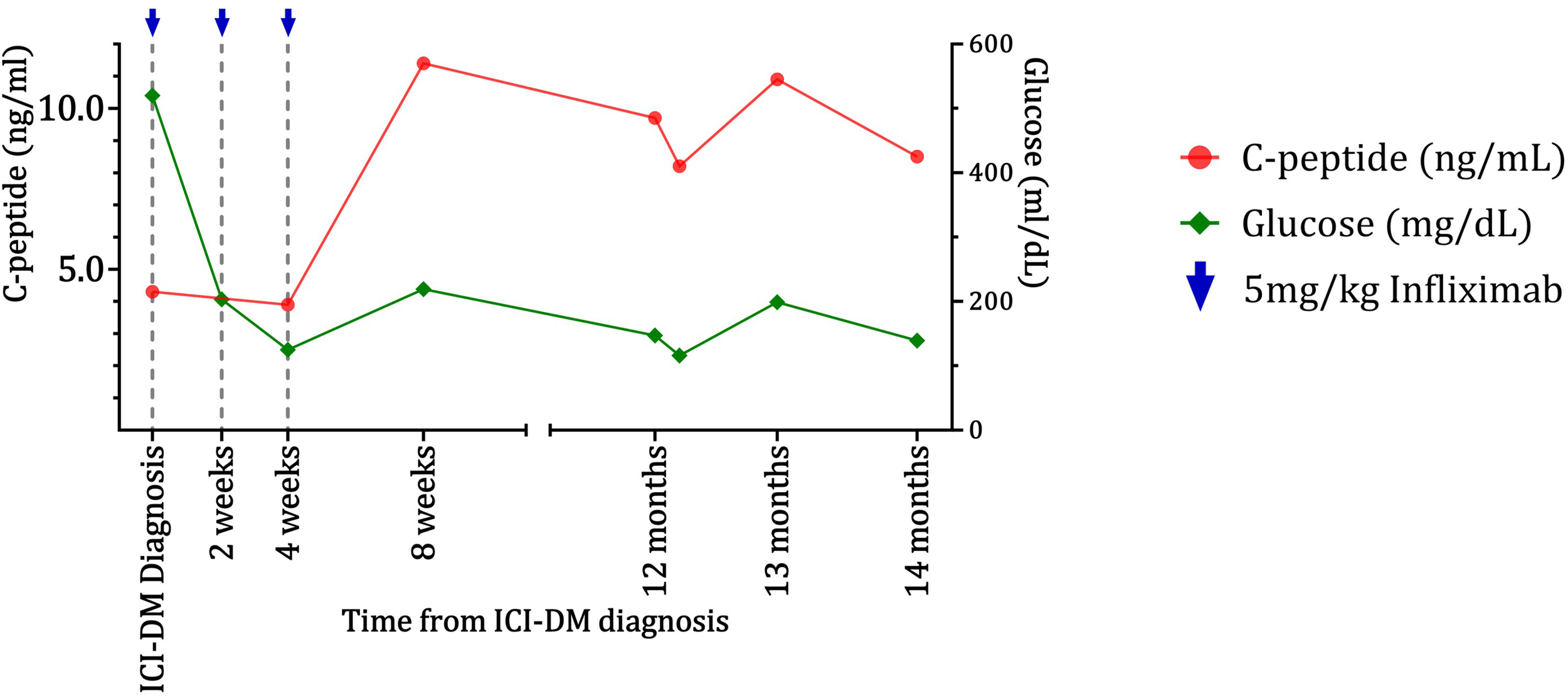 Improvement and maintenance of beta-cell function as indicated by C-peptide levels for the case 2 patient following infliximab treatment. C-peptide (red) and glucose (green) data for the case 2 patient show maintenance of C-peptide for over 1 year after worsening of diabetes and infliximab injections.