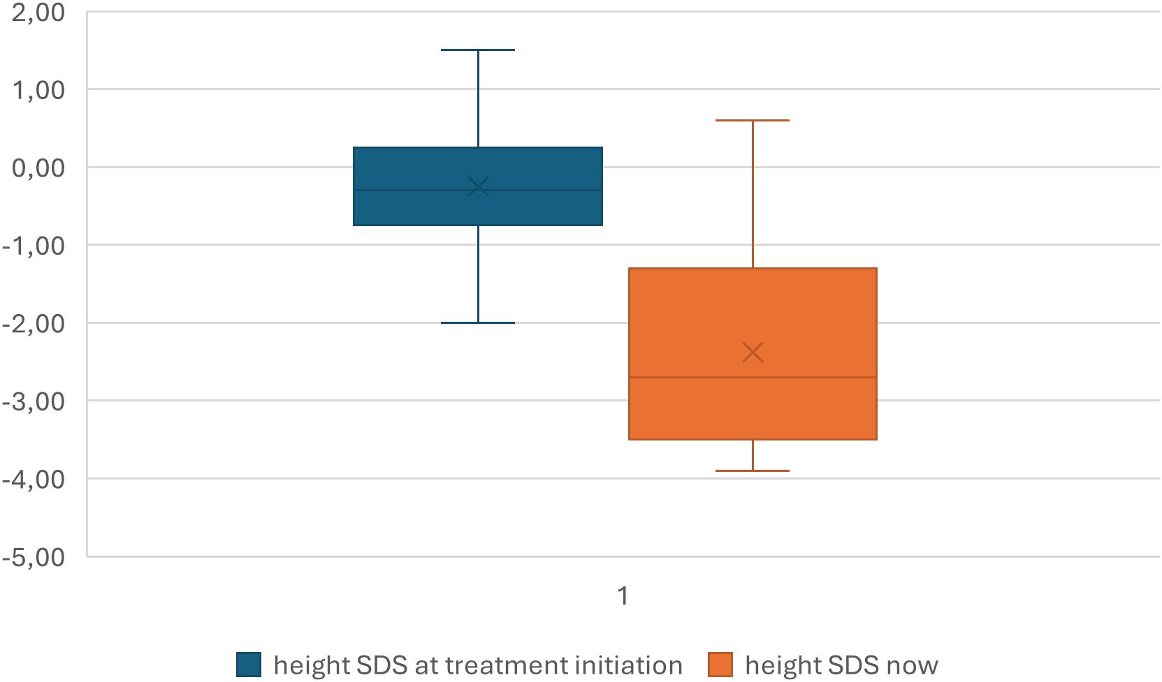 Short stature, defined as a height standard deviation score (SDS) ≤ -2 for the child’s age and sex, was present in 67% of DMD patients at the last annual follow-up. A decline in height SDS since the initiation of corticosteroid therapy was observed, with -2.37 SDS on average (Figure 1, Table 2). Obesity, defined as a BMI SDS ≥ 2 for the child’s age and sex, was present in 29% of the cohort. Based on body composition data (fat% SDS), 57% of the participants were classified as obese. Lipid abnormalities were present in 76% of the patients. No hypertension was observed. Insulin resistance, defined based on the HOMA-IR calculation, was present in 9.5% of the patients.