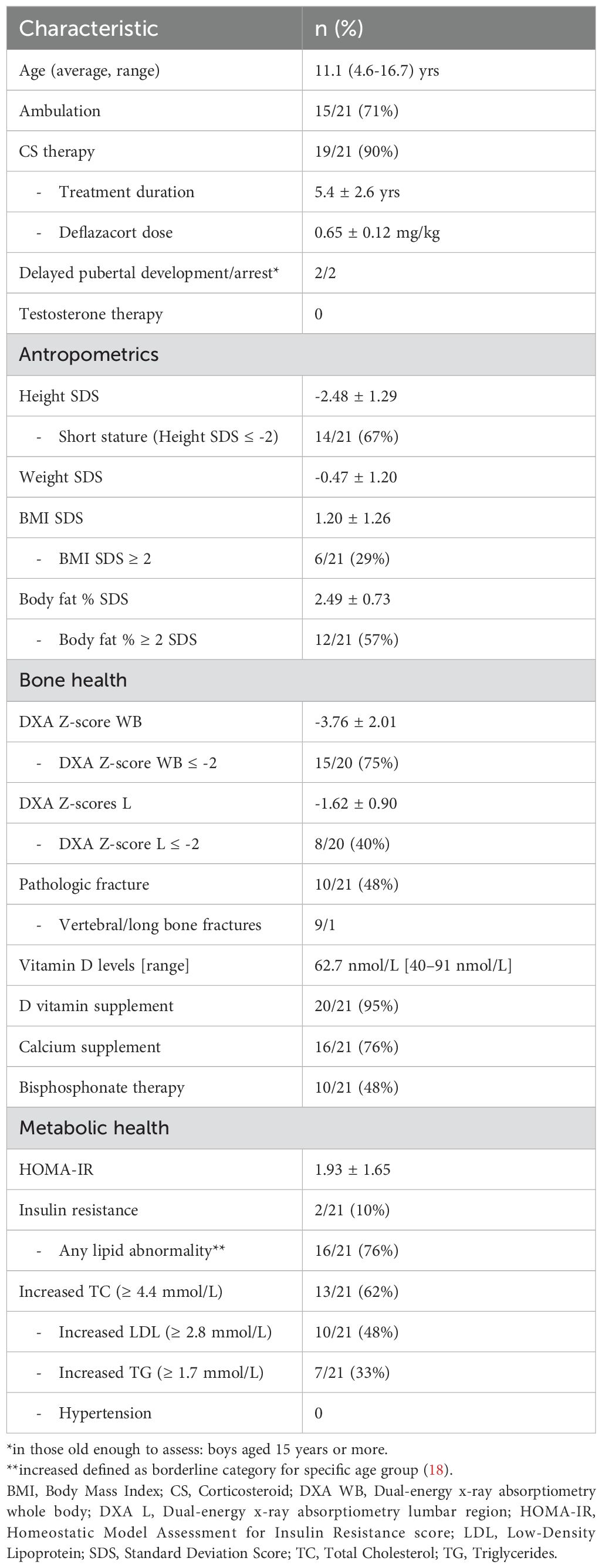Results: A total of 21 patients (average age 11.1, range 4.6-16.7 yrs) were included in the study. Two patients were corticosteroid-naive, the rest treated with deflazacort (average treatment duration 5.4, range 1.1-11.3 yrs). At the time of final follow-up, 90% were diagnosed with an endocrine and/or metabolic disorder. Short stature was present in 67% of patients, a decline in height standard deviation score (SDS) since the initiation of corticosteroid therapy was observed, -2.37 SDS on average. Based on body composition data (fat % SDS), 57% were classified as obese. Lipid abnormalities were detected in 76% of patients. Insulin resistance (determined by HOMA-IR) was increased in 9.5% of patients; type 2 diabetes was not detected.