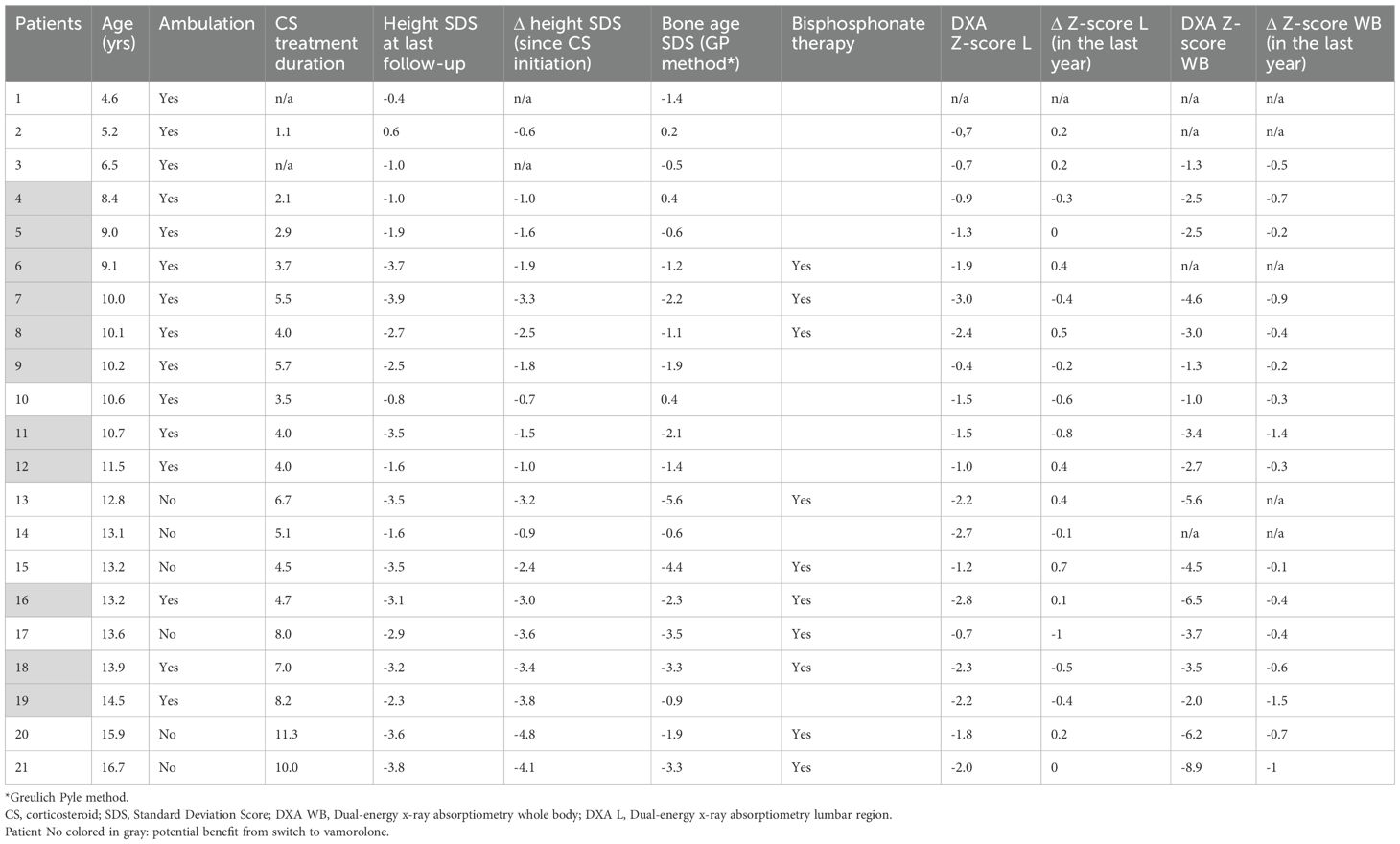 We have thus identified 11 ambulatory patients previously receiving deflazacort (patients Nr. 4,5,6,7,8,9,11,12,16,18 and 19), who could potentially benefit from a switch to vamorolone (marked in Table 2). As growing evidence emerges regarding the long-term safety and systemic effects of vamorolone, we anticipate that our current recommendations for therapy modification will require revision. Future adjustments to the clinical criteria will be directed toward optimizing therapeutic efficacy while ensuring the judicious allocation of healthcare resources.