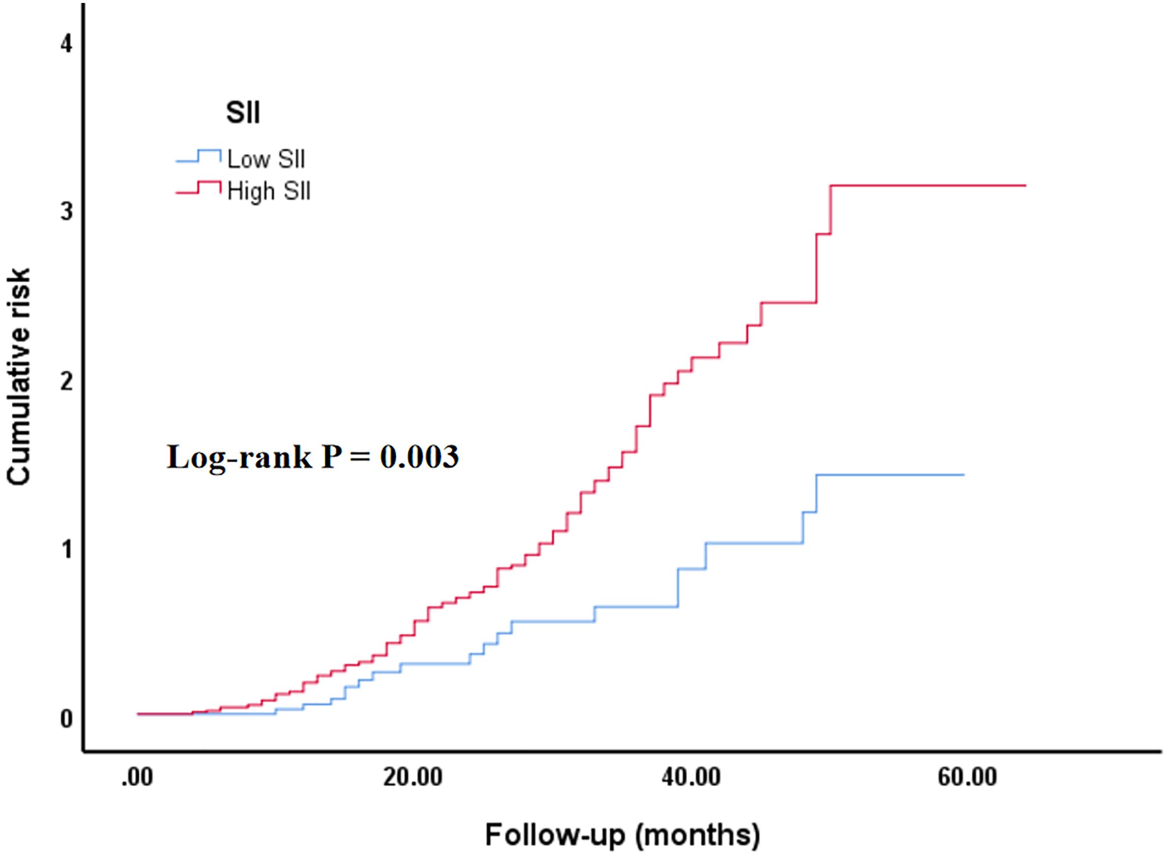 Additionally, the cumulative ACM risk was significantly higher in the high SII group in comparison with the low SII group. KM survival curves demonstrated a persistent notable difference between the two groups from the early stages of follow-up (log-rank p = 0.003) (Figure 1).