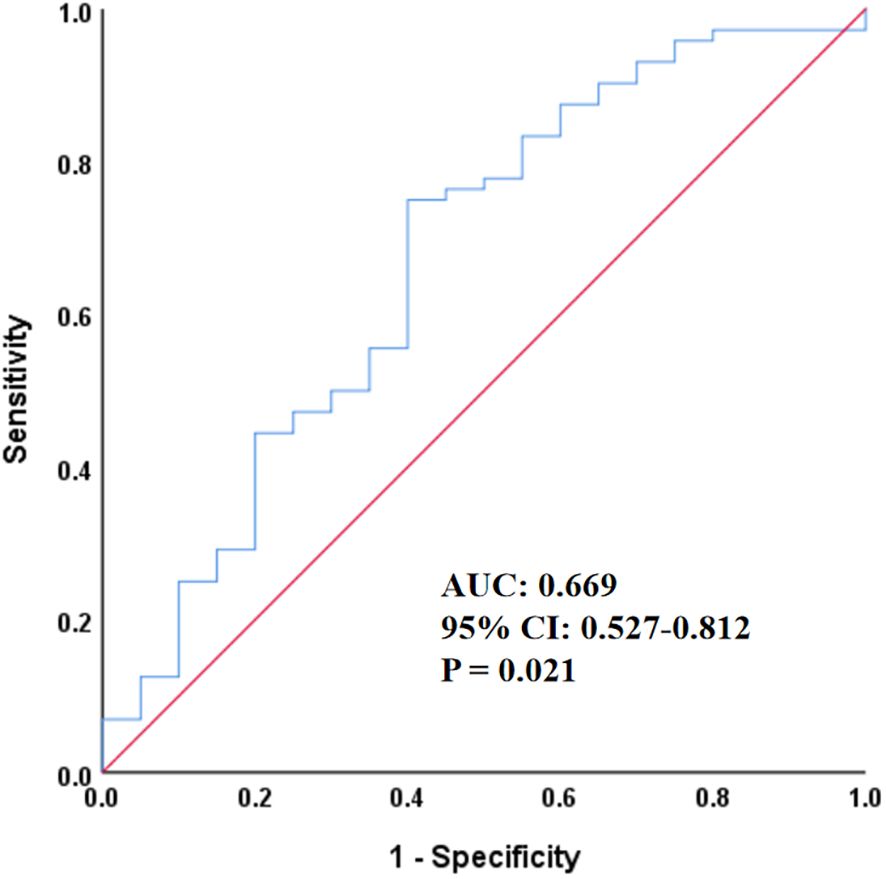 As shown in Figure 2, ROC curve analysis was performed to evaluate the ability of SII to predict ACM in patients with stages IIIB–IV EGFR-mutated lung adenocarcinoma. The area under the curve (AUC) was 0.669 (95% CI = 0.527–0.812; p = 0.021), indicating a modest but statistically significant predictive value.