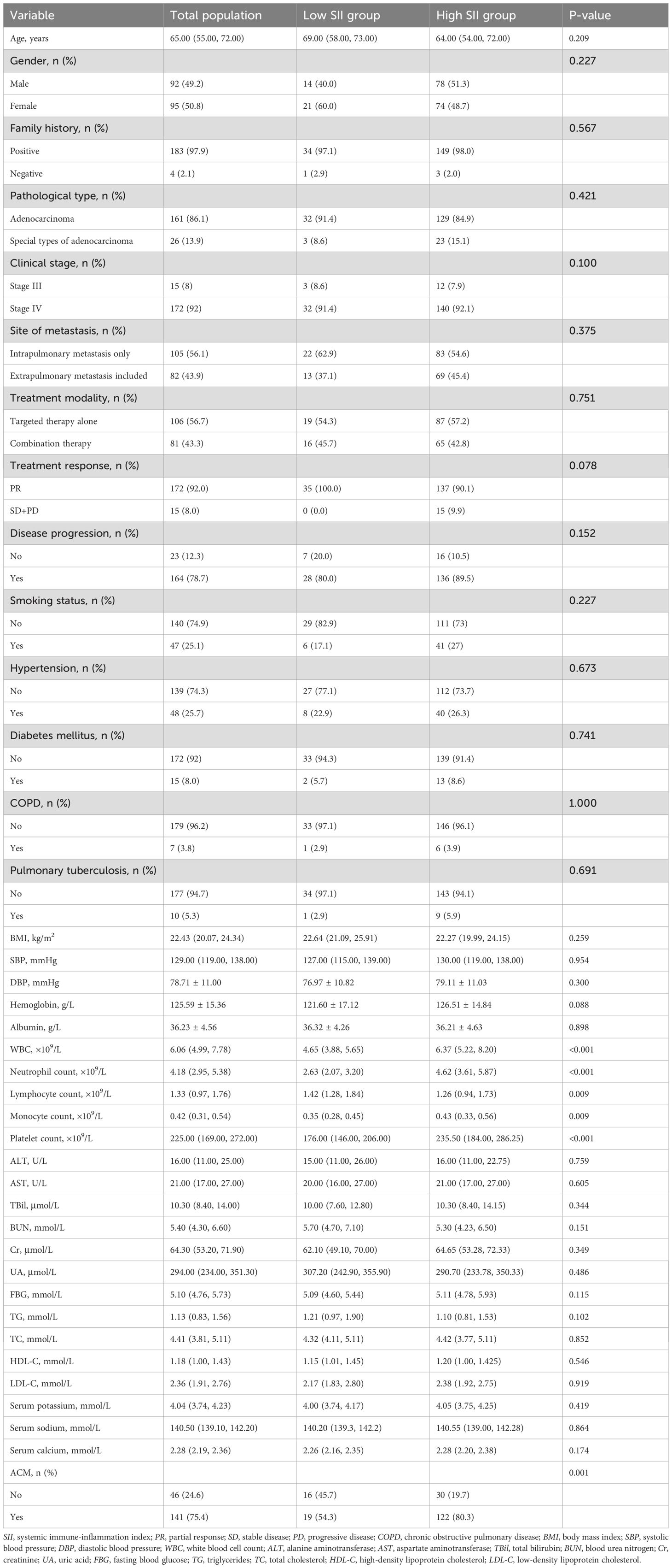 Methods: The clinical data of 187 individuals with stages IIIB–IV EGFR-mutated lung adenocarcinoma from Anhui Chest Hospital, collected from June 2017 to December 2023, were retrospectively analyzed. SII was calculated as platelet count × neutrophil count/lymphocyte count. The receiver operating characteristic (ROC) curve was employed to determine the optimal threshold SII, and individuals were classified as low and high SII groups. ACM serves as the primary endpoint. Univariate and multivariate analyses were conducted using Cox proportional hazards models. The robustness of the findings was tested by subgroup and sensitivity analyses.