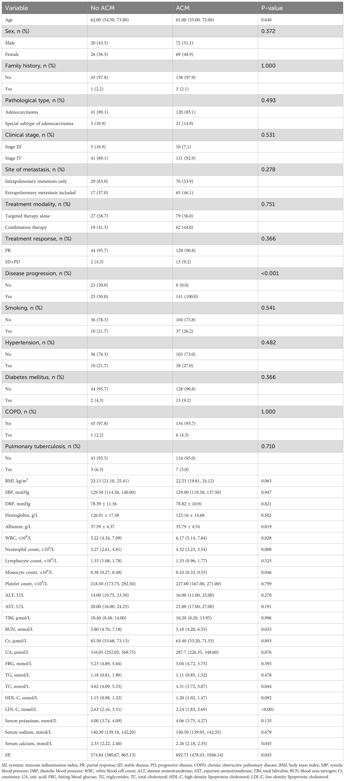 As illustrated in Table 2, compared with the non-ACM group, the ACM group had notably reduced levels of LDL-C (p < 0.001), BUN (p = 0.035), TC (p = 0.044), albumin (p = 0.019), SC (p = 0.045), and elevated levels of disease progression (p < 0.001), WBC (p = 0.028), neutrophil count (p = 0.008), and monocyte count (p = 0.046). Additionally, no substantial differences between the two groups were found in clinical stage, site of metastasis, treatment modality, family history, treatment response, age, smoking status, pathological type, HP, DM, COPD, PTB, BMI, SBP, DBP, hemoglobin, lymphocyte count, platelet count, HDL-C, Cr, ALT, FBG, AST, TBil, UA, TG, SP, SS, and SII (p > 0.05).