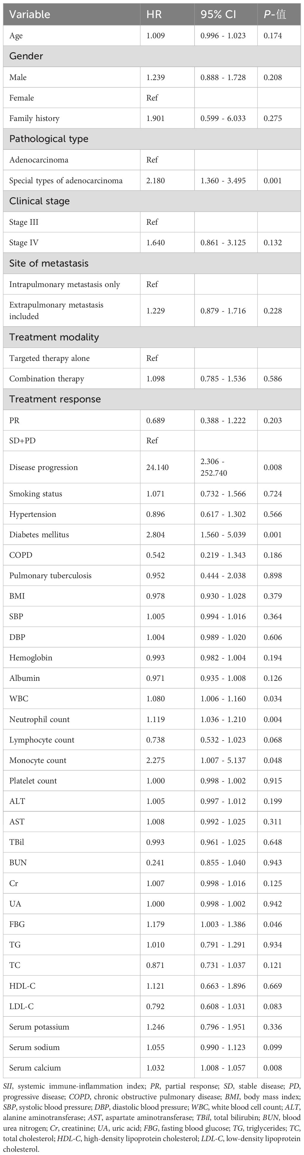 SII, which consists of lymphocyte, platelet, and neutrophil counts, can comprehensively and objectively assess the dynamic balance between immune status and inflammatory response (11). Hu et al. (12) first proposed the concept of SII and found that a higher SII in individuals with liver cancer was notably associated with an elevated risk of recurrence. Existing evidence has demonstrated that SII is linked to the prognosis of multiple solid tumors, including pancreatic cancer, esophageal cancer, and gastric cancer (13–15). Moreover, systemic inflammatory indices such as the SII reflect the dynamic balance between host immunity and tumor-related inflammation. Elevated SII indicates increased neutrophil- and platelet-driven inflammatory activity, along with suppressed lymphocyte-mediated immune surveillance, which may further enhance the aggressiveness of EGFR-mutant tumors (8). Recent studies suggest that chronic inflammation contributes to epithelial–mesenchymal transition (EMT), resistance to EGFR tyrosine kinase inhibitors (EGFR-TKIs), and metastatic potential in EGFR-mutant NSCLC (16). Berardi et al. (17) found that individuals with advanced NSCLC and high pretreatment SII had significantly shorter OS following first-line chemotherapy or targeted therapy. Their finding suggests that SII can independently predict unfavorable outcomes. Our results align with those of Berardi et al. (17), indicating that SII is notably related to ACM, whether treated as a continuous or categorical variable. Biswas et al. (18) have demonstrated that SII is a critical marker for predicting OS and progression-free survival (PFS) among stage III locally advanced NSCLC patients. Other researchers (19) suggested that individuals with stage IIIA/N2 NSCLC and elevated SII before treatment may require more intensive adjuvant therapies. Moreover, a recent study (20) identified SII as the strongest predictor of pulmonary complications following LC resection. Tong et al. (8) demonstrated that high SII is associated with chemoresistance among individuals with advanced NSCLC undergoing first-line platinum-based chemotherapy. Patients with SII ≥ 660 tend to have lower response rates to chemotherapy and more advanced clinical stages than those with SII< 660. These findings indicate that chemoresistance remains a major challenge in cancer treatment. SII ≥ 660 can predict poor prognosis in advanced NSCLC, and pretreatment SII is an independent indicator for predicting OS, outperforming other peripheral blood biomarkers. Therefore, pretreatment SII may help predict patients’ responsiveness to chemotherapy. A retrospective study (7) examined the performance of the blood-based SII in 203 EGFR-mutant advanced lung ADC patients who received first-line EGFR-TKIs. Their results indicated that individuals with SII ≥ 1,066.935 have a greater likelihood of poor Eastern Cooperative Oncology Group performance status (ECOG-PS). In their multivariate analysis, SII was an independent biomarker for assessing OS (HR = 2.802; 95% CI = 1.659–4.733; p < 0.001) and PFS (HR = 2.577; 95% CI = 1.677–3.958; p < 0.001). Their findings suggest that SII is notably related to prognosis in EGFR-mutant lung ADC patients receiving first-line EGFR-TKIs, with higher SII indicating greater tumor burden, more profound immunosuppression, and poorer outcomes.
